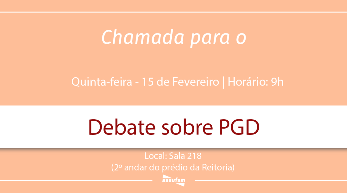 ATENÇÃO TAE da UFSM, o GT PGD da Assufsm acontece no próximo dia 15 de fevereiro, às 9h, na Sala 218, no segundo andar do prédio da Reitoria.
