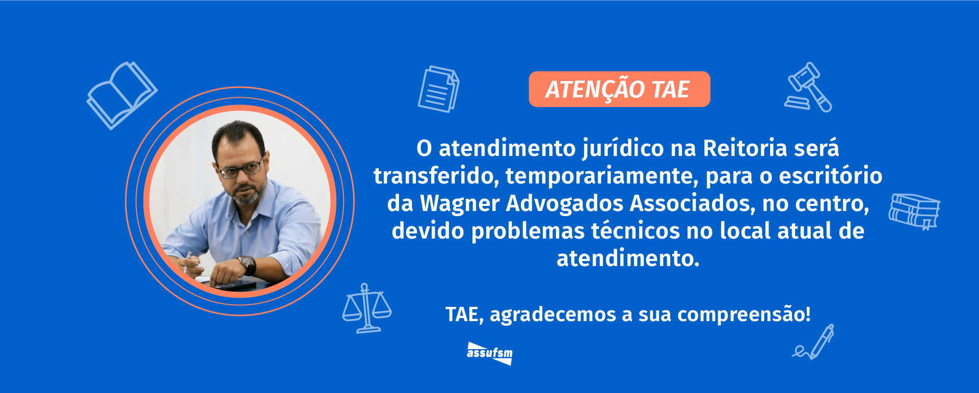 A partir desta quarta-feira (7), os plantões jurídicos da Wagner Advogados Associados também irão ocorrer no HUSM. A coordenação da Assufsm conseguiu que os atendimentos aconteçam na sala 4.043, no 4º andar do Hospital. O plantão será das 14h30min às 17h na sala 4.043 no 4º andar do Hospital Universitário.