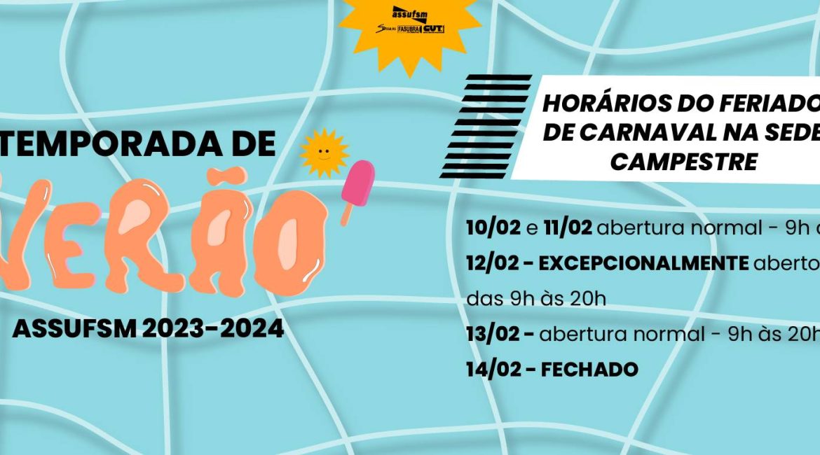 Coordenação do Sindicato informa que os horários de atendimento da Assufsm e da Sede Campestre sofrerão alterações durante o recesso de Carnaval. Atente-se: