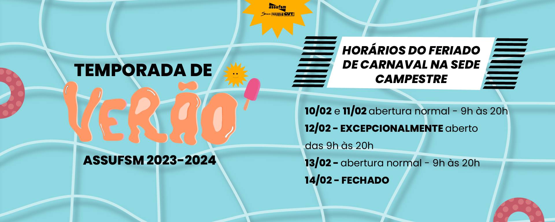 Já a Sede Campestre da Assufsm também terá alterações de horário. Nos dias 10 e 11 de fevereiro, a Sede abrirá normalmente, das 9h às 20h. Excepcionalmente na segunda-feira, dia 12 de fevereiro, a Sede e as piscinas irão ABRIR ao público, das 9h às 20h.