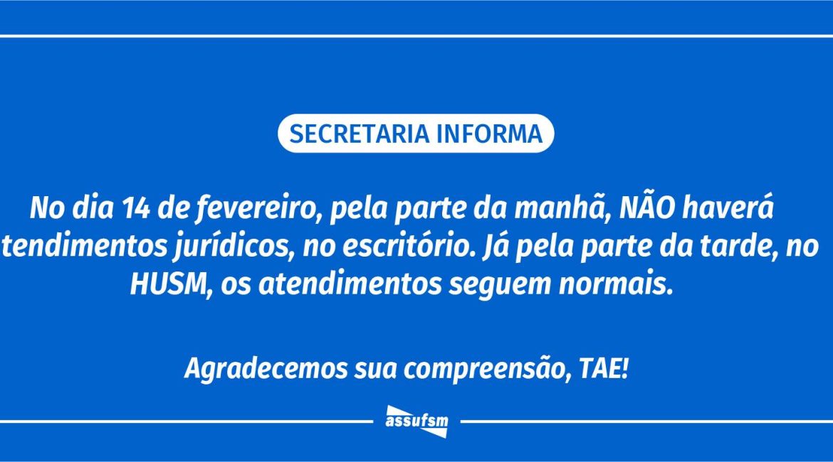 Já os atendimentos do HUSM estarão com os agendamentos abertos para o dia 14, das 14h30min às 17h. As consultas jurídicas ocorrem na sala 4.043 no 4º andar do Hospital Universitário. Os agendamentos podem ser feitos na secretaria da Assufsm pelos contatos (55)3220-8123 e (55)3220-8385, além do e-mail secretaria.assufsm@terra.com.br