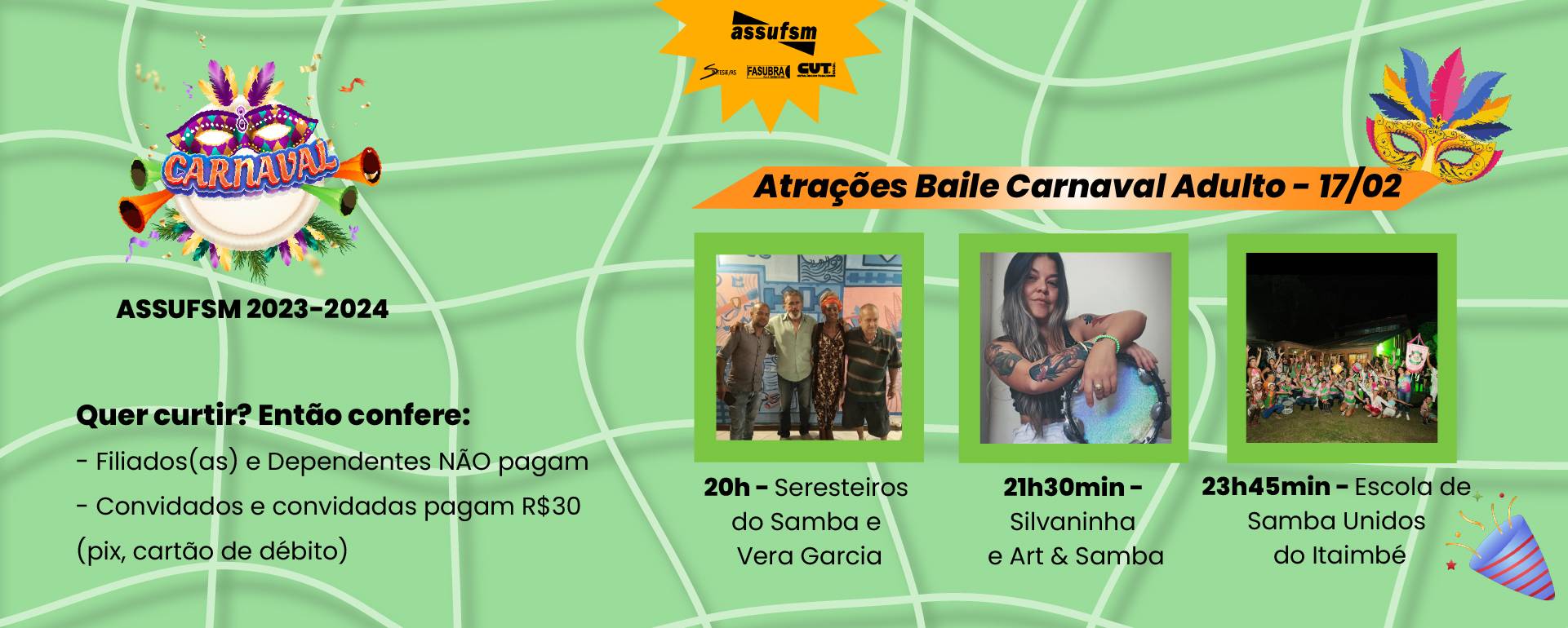 O próximo sábado (17) vai ser dia de Carnaval na Sede Campestre da Assufsm. Os portões abrem às 9h da manhã e a folia tem início com muito samba e pagode na área das piscinas. Às 16h inicia o baile infantil e às 20h é a vez do baile adulto, que vai contar com Os Seresteiros do Samba, Silvaninha & Art Samba e, fechando a noite, a escola de Samba Unidos do Itaimbé.