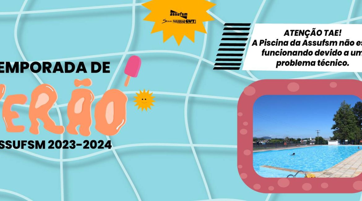 Atenção TAE, informamos que, devido a um problema técnico, a piscina grande, da Sede Campestre da Assufsm, não está funcionando. Isso ocorre em função dos motores de bombeamento terem estragado.