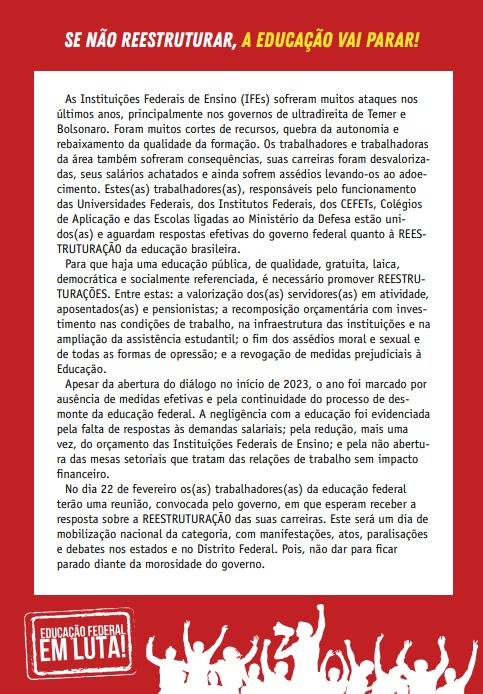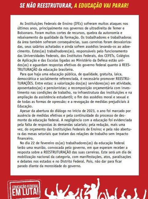 A FASUBRA, em conjunto com o ANDES e SINASEFE colocam uma carta sobre o dia de luta, chamado para dia 22 de fevereiro, leia abaixo: