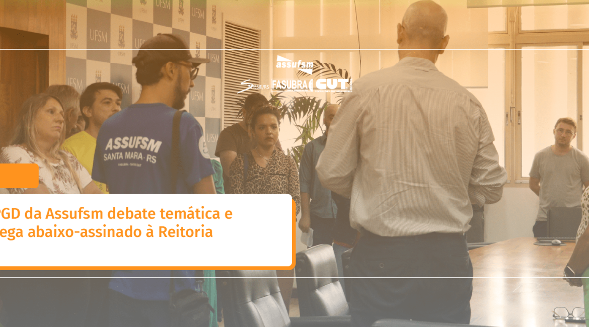 Após a leitura do documento contruído pelo GT PGD, os e as presentes foram até o Gabinete do Reitor, onde foram recebidos pelo Reitor Luciano Schuch e pela Vice-Reitora Martha Adaime. O GT entregou à Reitoria os resultados da Pesquisa de Opinião do PGD realizada pela Assufsm, bem como os abaixo-assinados online e presencial e as análises realizadas pelo escritório da Wagner Advogados Associados (veja mais abaixo).