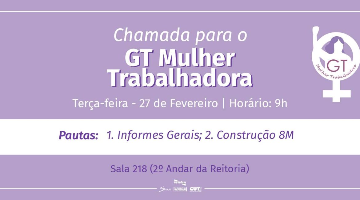O GT Mulheres Trabalhadoras da Assufsm acontece no próximo dia 27 de fevereiro, às 9h, na Sala 218, no segundo andar do prédio da Reitoria.