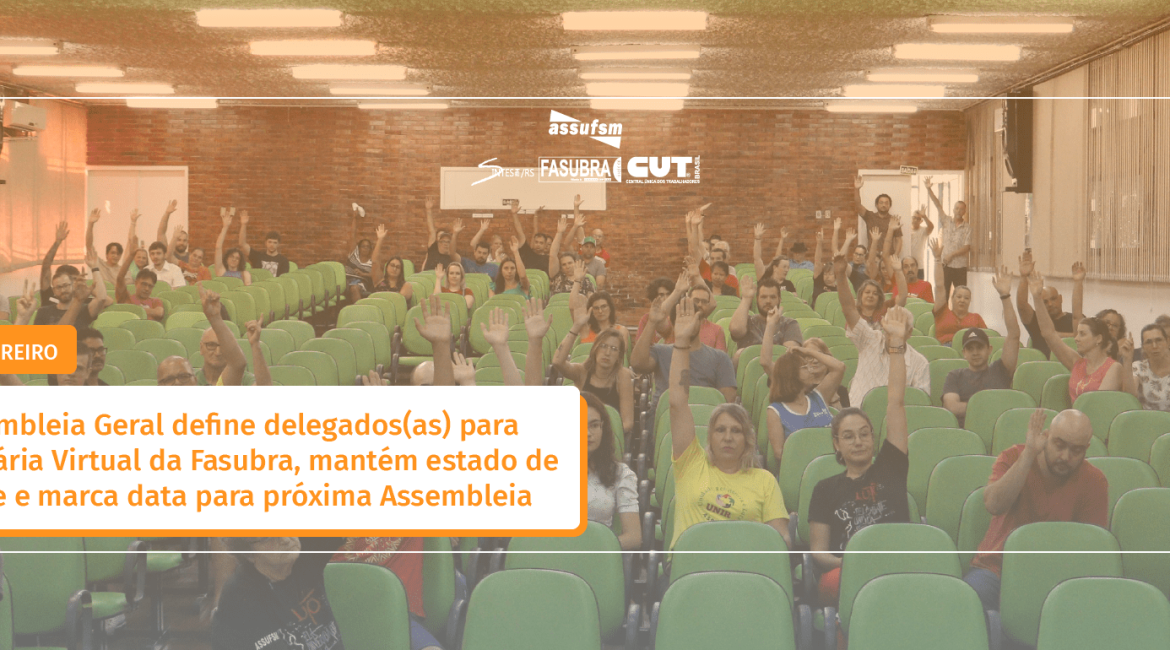Na manhã de ontem (29), no auditório Flávio Miguel Schneider, anexo ao Centro de Ciências Rurais, a categoria se reuniu em Assembleia Geral para debater as seguintes pautas: avaliação das mesas de negociação com o governo; indicativo de greve; e eleição de delegados(as) para Plenária Virtual da Fasubra. A Assembleia foi transmita ao vivo em nosso canal do Youtube, acompanhe aqui.