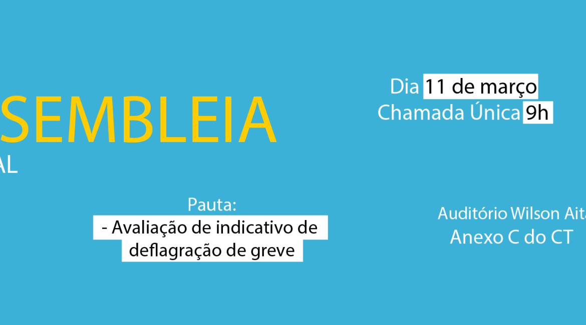 A Assufsm convoca toda a categoria a participar da Assembleia Geral a ser realizada na próxima segunda-feira, dia 11 de março, com chamada única às 9h, no Auditório Wilson Aita, no anexo C do Centro Tecnologia (CT).
