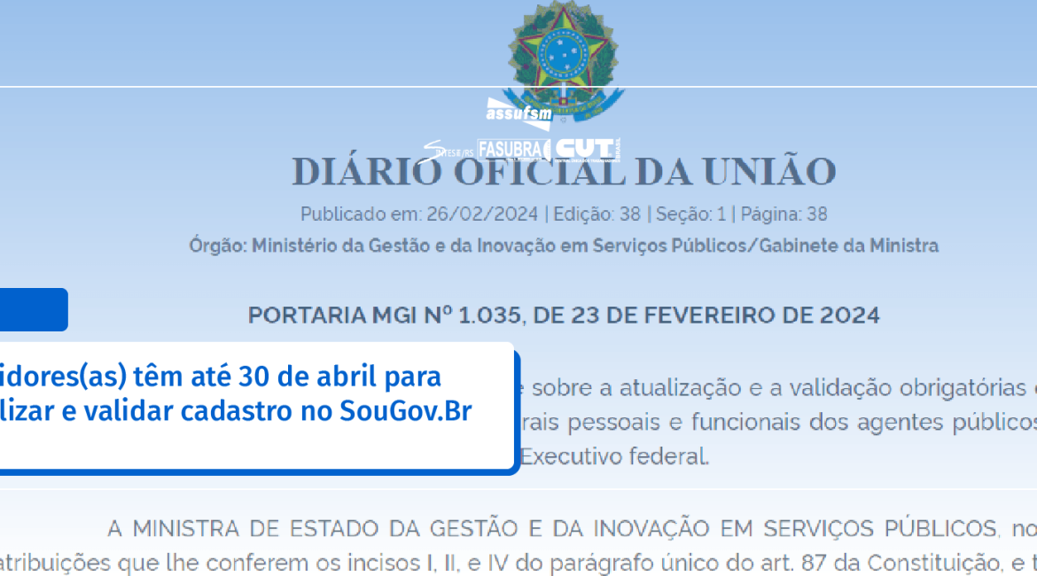 O Ministério da Gestão e da Inovação em Serviços Públicos publicou a Portaria MGI Nº 1.035, datada de 23 de fevereiro de 2024. O texto estabelece medidas relacionadas à atualização e validação obrigatórias dos dados cadastrais pessoais e funcionais dos agentes públicos civis do Poder Executivo Federal.
