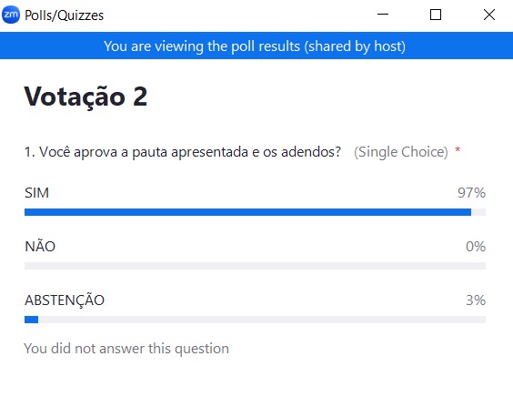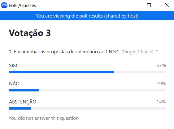 No período da tarde do dia 9 de março, a Plenária Nacional Virtual da FASUBRA transcorreu de acordo com a pauta prevista. Houve a Análise de Conjuntura com a participação de 40 pessoas que se inscreveram para se manifestar. Logo em seguida, aconteceu a votação com a participação 177 delegados, sendo 71 mulheres e 106 homens, representantes das 37 entidades participantes da Plenária. A votação se deu por enquetes. Na primeira enquete: Ratificar o indicativo e deflagração da greve no dia 11 de março – houve 143 votantes, sendo que 96% dos delegados votaram sim, 2% votaram não, com 2% de abstenções. Na segunda enquete: Você aprova a pauta apresentada e os adendos? – houve 145 votantes, sendo que 97% votaram sim, 0% votaram não, com 3% de abstenções. Na terceira enquete: Encaminhar as propostas de calendário ao Comando Nacional de Greve – houve 138 votantes, sendo que 67% votaram sim, 19% votaram não e 14% se abstiveram.