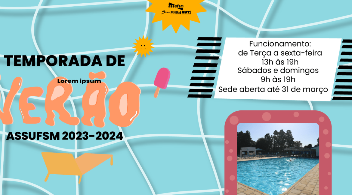 Nessa temporada de verão 2024, a Sede Campestre da Assufsm está funcionando em novo horário, a partir do dia 12 de março: das 13h às 19h, de terça a sexta-feira. Já de sábado a domingo das 9h às 19h. Por isso, atente-se ao funcionamento da sua Sede Campestre TAE e aproveite o final do verão conosco.
