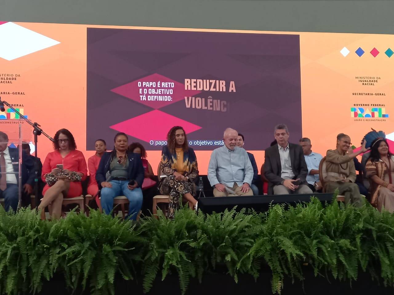 Nesta quinta-feira (21), o Comando Nacional de Greve esteve juntamente com a representantes da Universidade de Brasília na cerimônia de lançamento do Plano Juventude Negra Viva. Na ocasião, estavam presentes o presidente Luiz Inácio Lula da Silva e diversos(as) ministros(as).