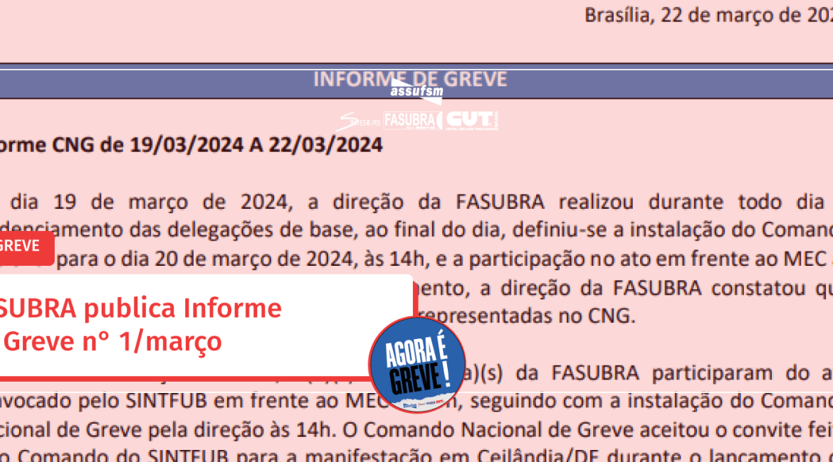 No dia 22 de março, a Fasubra publicou o primeiro Informe de Greve (IG), do mês de março.