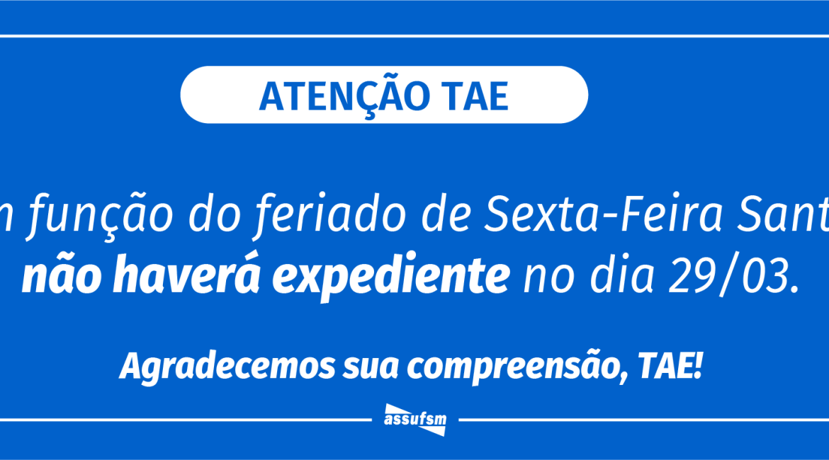 TAE, atenção. No dia 29 de março, a Assufsm não terá expediente devido ao feriado de Sexta-Feira da Paixão, ou mais conhecido como Sexta-Feira Santa.