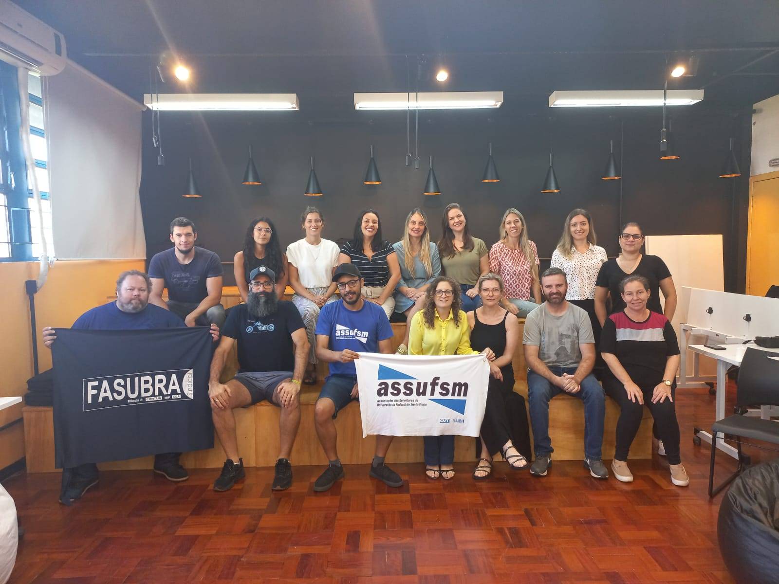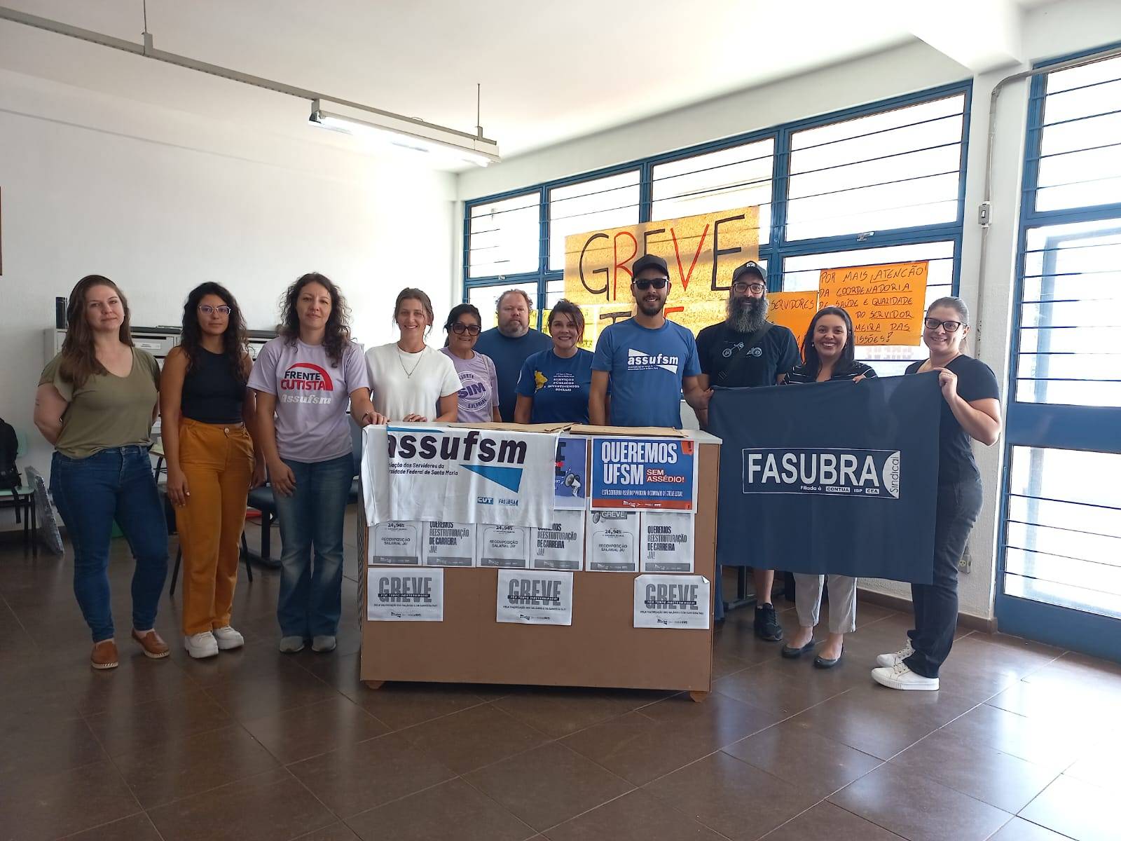 Aqui, na UFSM, a mobilização também segue a todo vapor – tanto no campus de Santa Maria quanto nos demais campi da Universidade. Além das atividades do calendário de greve da Assufsm, todas as manhãs, às 9h – no lonão, em frente do Centro de Ciências Naturais e Exatas no campus sede – 0 Comando Local de Greve se reúne para debater ações de mobilização. Nesta manhã (27), os(as) TAEs em greve fizeram uma visita ao Colégio Politécnico da Universidade Federal de Santa Maria para conversar com colegas.