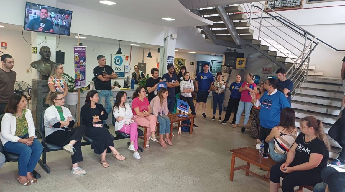 Nesta manhã, o Comando Local de greve discutiu e planejou ações para a Mobilização em frente ao Arco de entrada do campus sede, a ser realizada a partir das 7h de quarta-feira (03). Além disso, informes locais foram trazidos pelos(as) TAEs que também fizeram o debate de conjuntura e pautas da greve. O representante estadual da Central Única dos Trabalhadores (CUT-RS) Marcelo Carlini esteve, nesta manhã, em visita ao Comando Local e também contribuiu para o debate, com uma avaliação do movimento grevista no RS e país.
