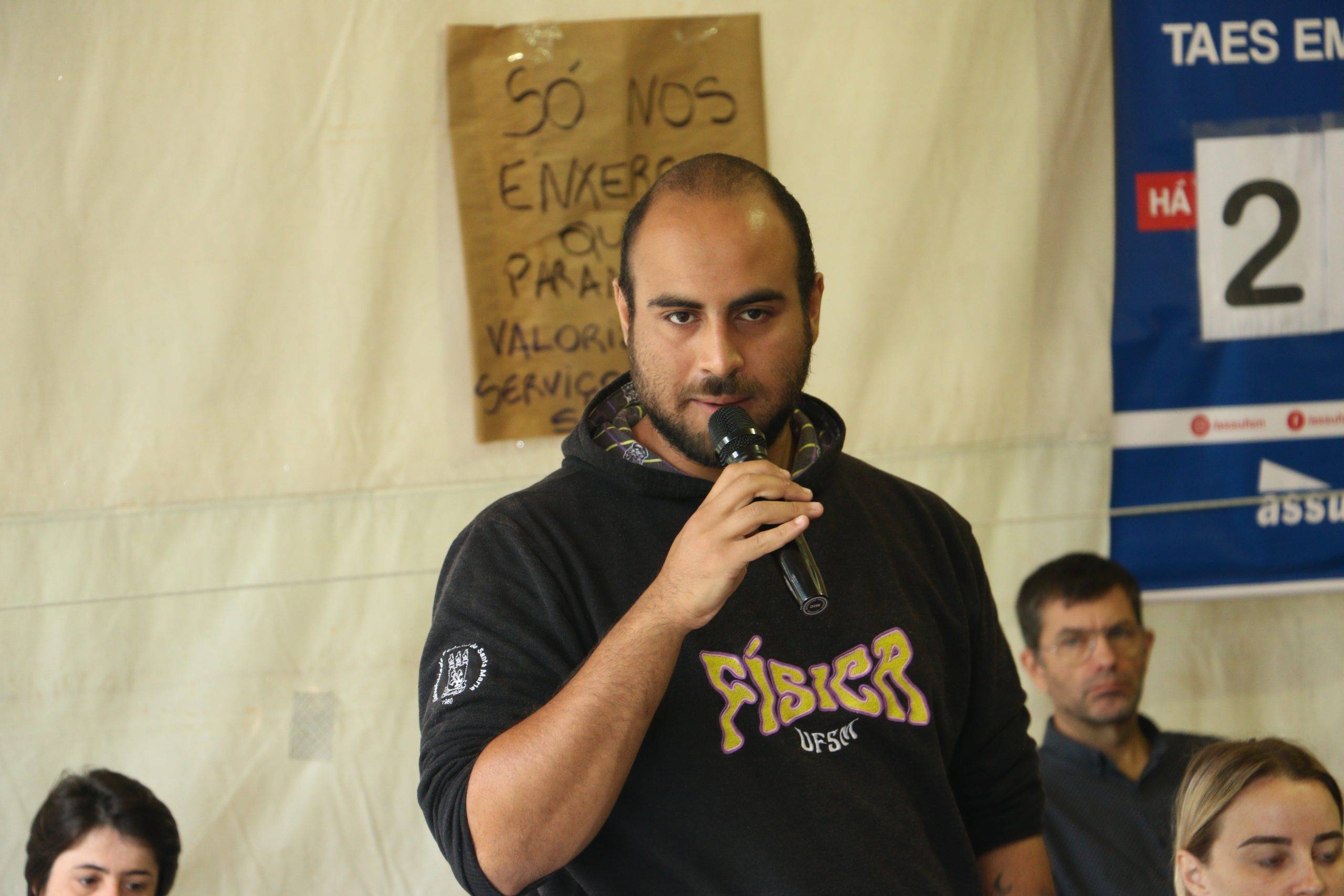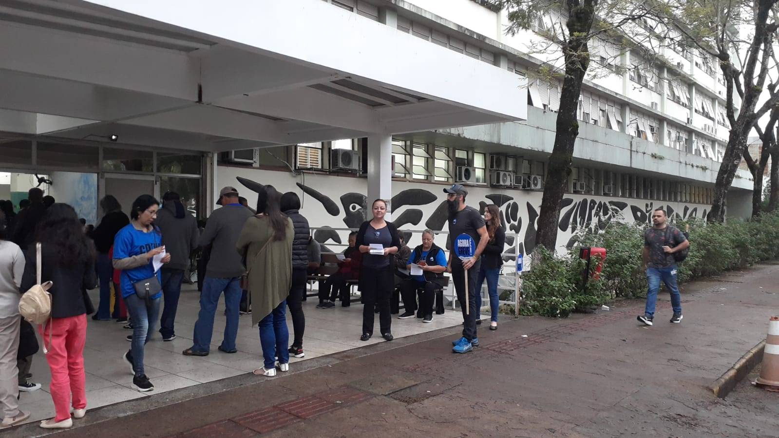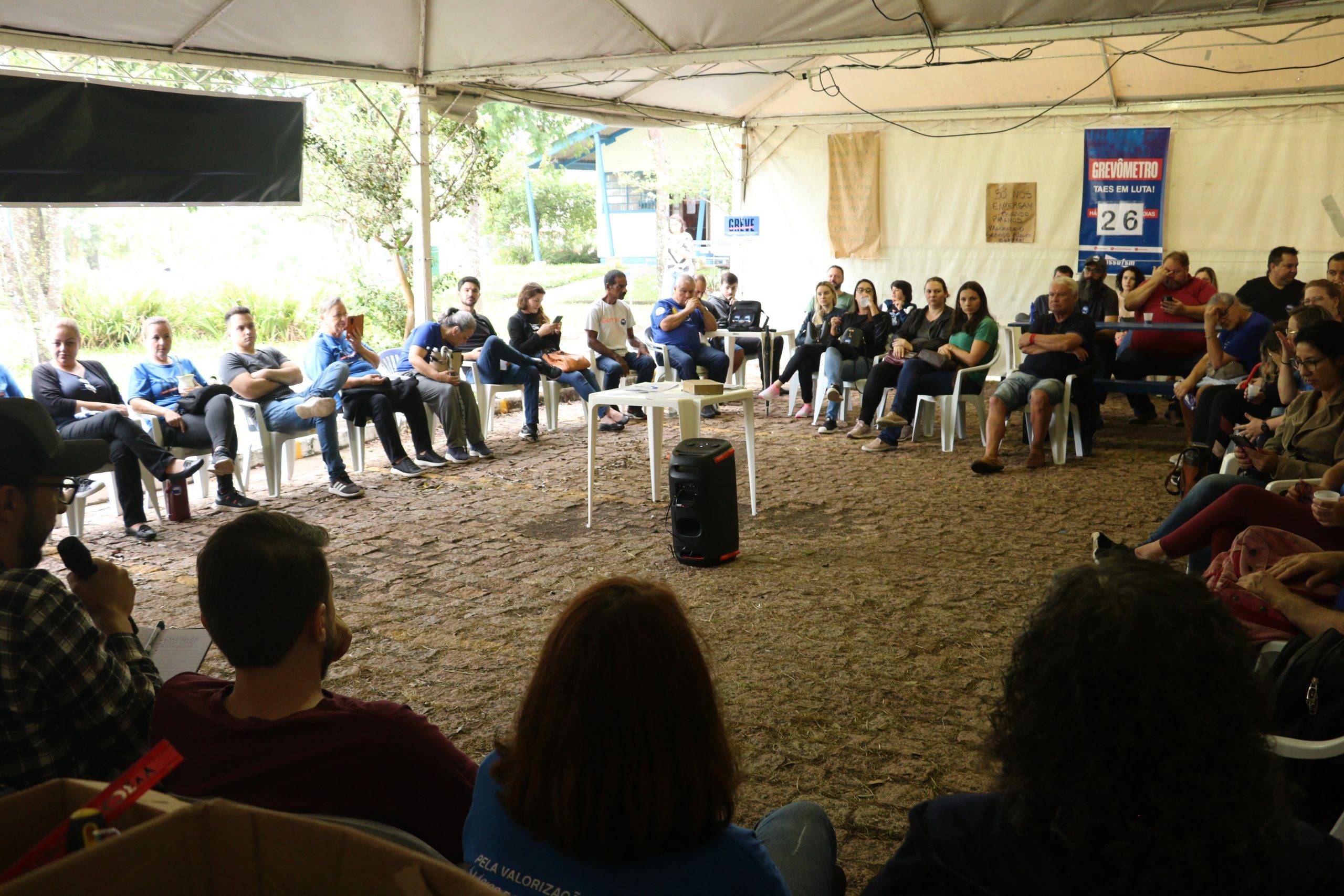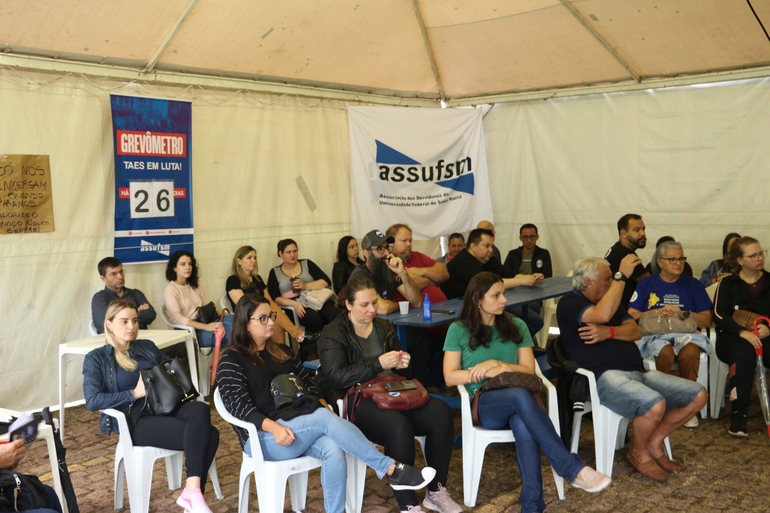 O Comando Local de Greve iniciou a manhã desta segunda-feira (08), vigésimo sexto dia de greve, com panfletagem em frente ao HUSM. Em seguida, a discussão e construção do movimento de greve seguiu no lonão da greve, em frente ao Centro de Ciências Naturais e Exatas. Na reunião desta manhã, somaram-se representantes do Instituto Federal Farroupilha, da Associação dos Pós-Graduandos da UFSM e do Diretório Central dos Estudantes que manifestaram apoio ao movimento paredista.