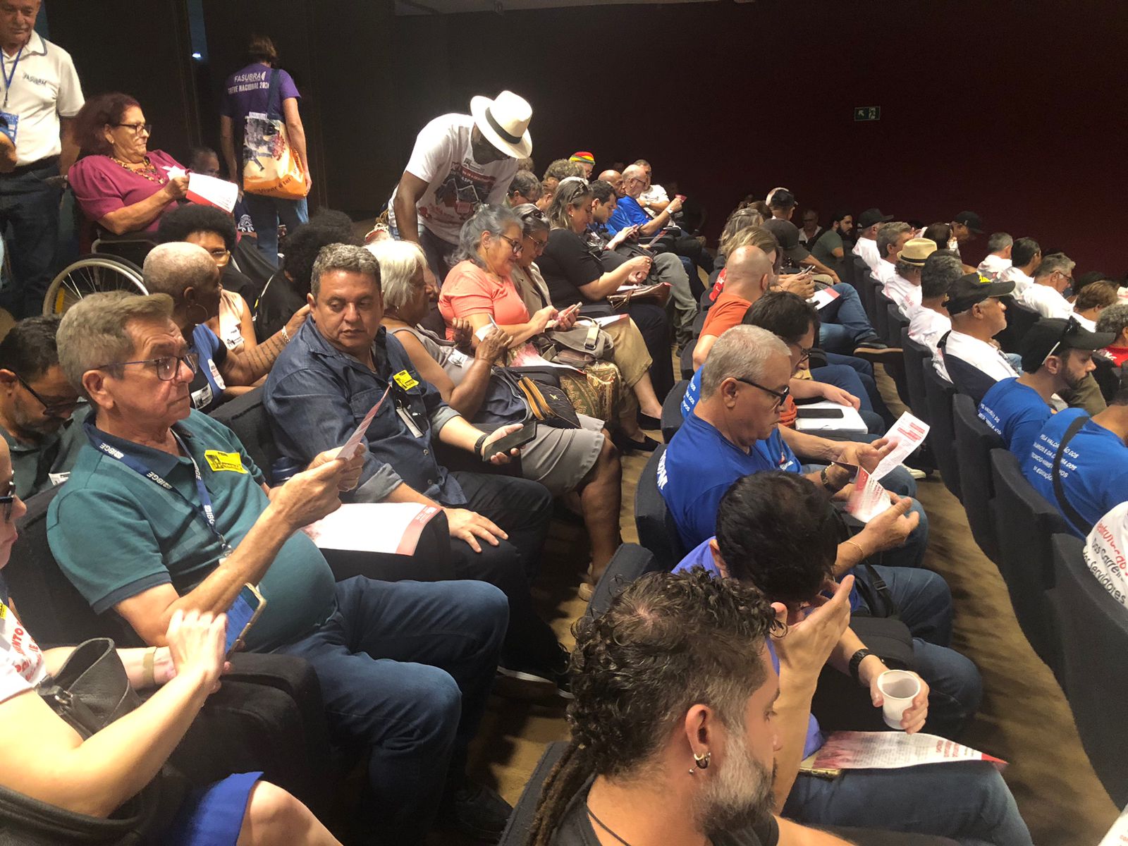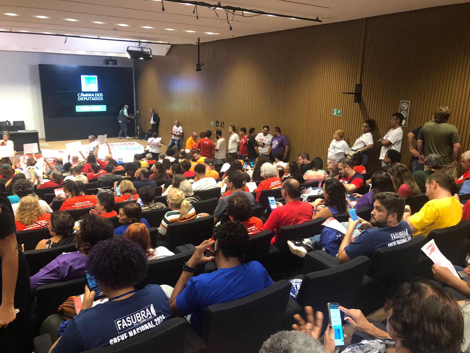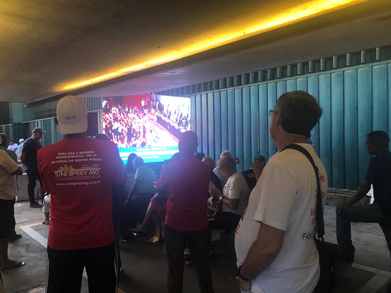 Do lado de fora, os caravaneiros, demais integrantes do CNG da FASUBRA e outras entidades da educação pública federal puderam acompanhar a audiência por um telão que foi montado pela Câmera.