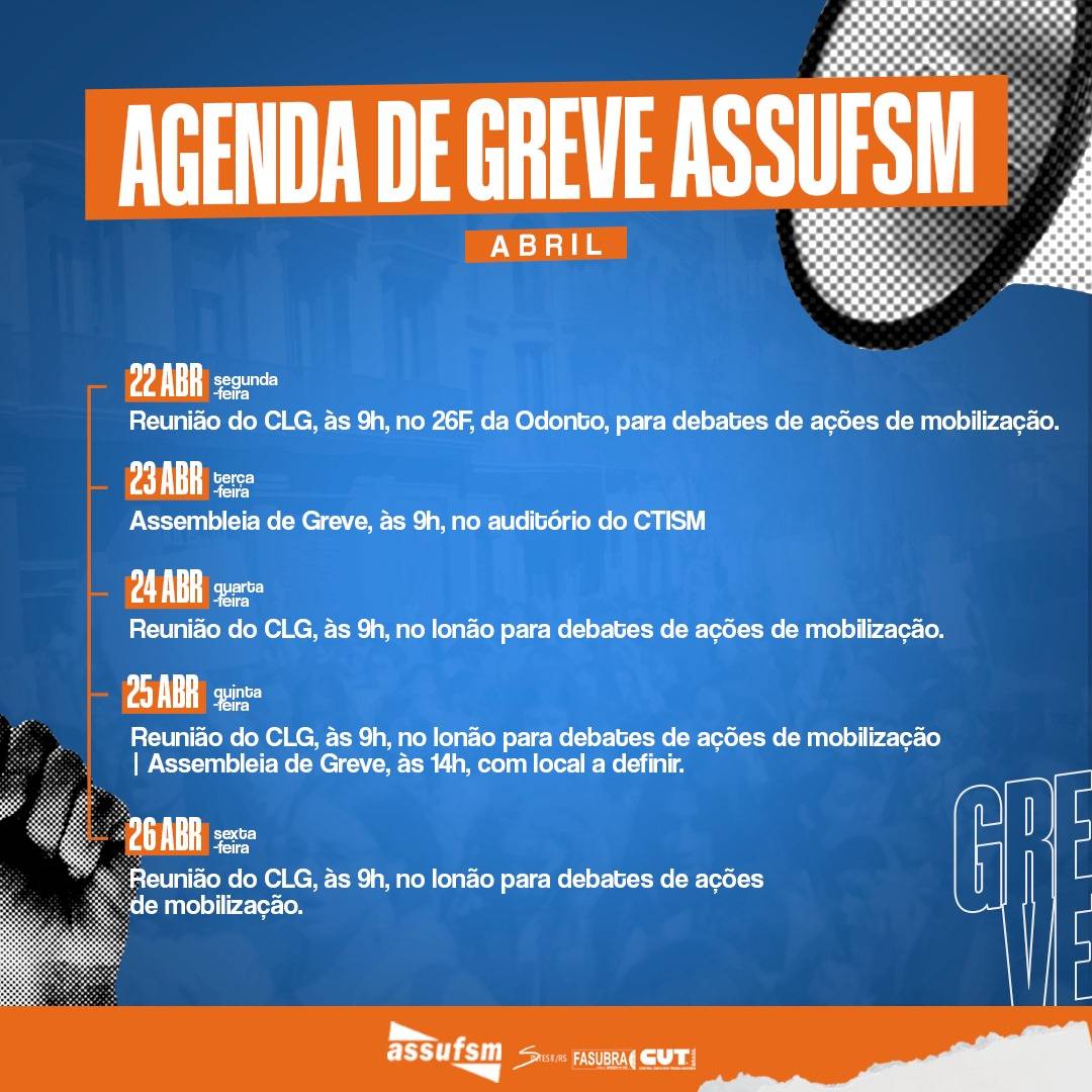 ➡ Terça-feira (23) – Assembleia de Greve, às 9h, no Auditório do CTISM.