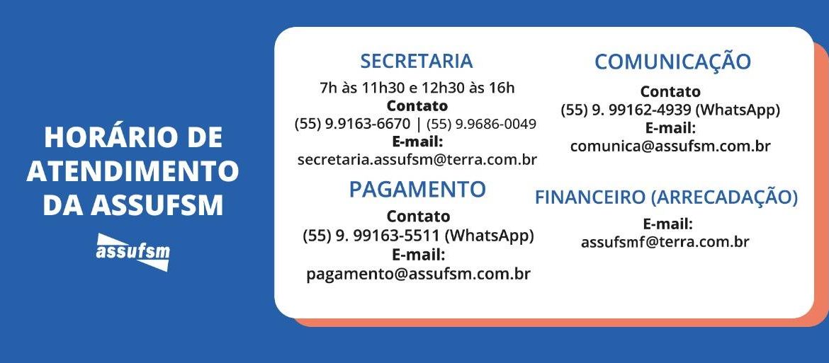 A Assufsm informa alterações de horário na Secretaria. A Secretaria da Assufsm estará atendendo de segunda a sexta-feira, das 7h às 11h30min e das 12h30min às 16h, na sala 217, no 2° andar do prédio da Reitoria.