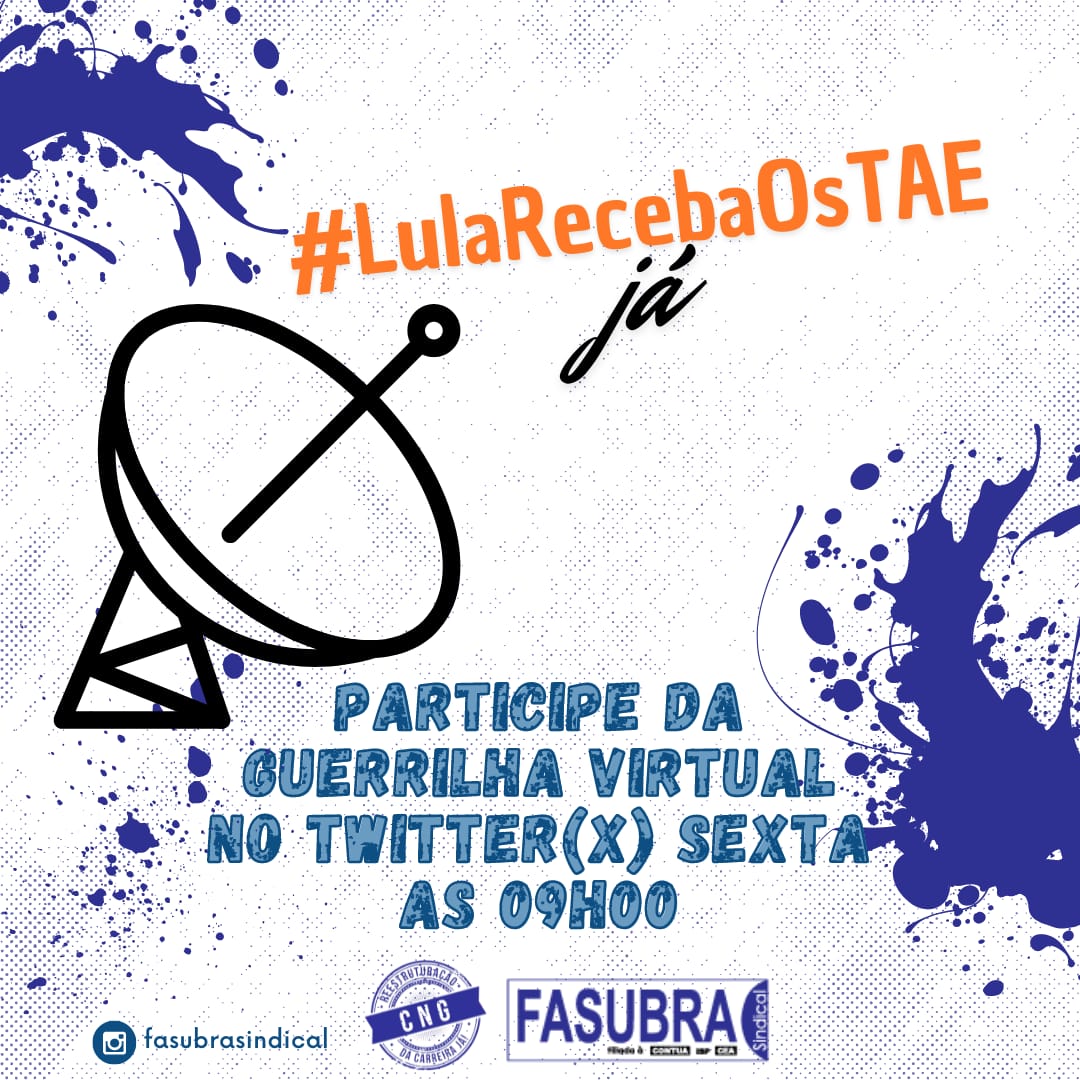 Essa ação só terá sucesso se os comandos locais atenderem a orientação do CNG/Fasubra e participarem ativamente com postagens no Twitter sobre nossa greve utilizando sempre essa hashtag #LulaRecebaOsTae