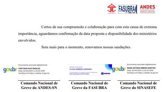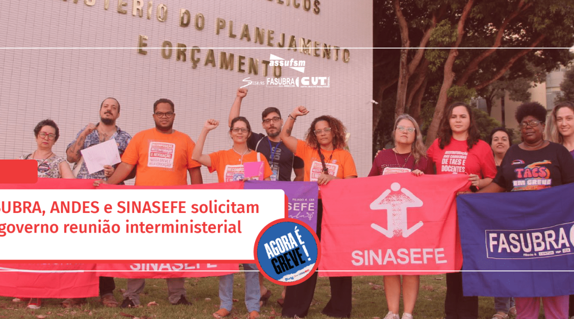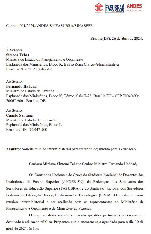 Nesta sexta feira, 26 de abril, os Comandos Nacionais de Greve da FASUBRA, do ANDES-SN, e do SINASEFE solicitaram reunião interministerial com os Ministérios do Planejamento e Orçamento, da Fazenda e da Educação. A referia reunião tem como objetivo discutir questões pertinentes ao orçamento destinado à educação pública. As entidades sugeriram o dia 30 de abril pela manhã como agenda desta atividade.