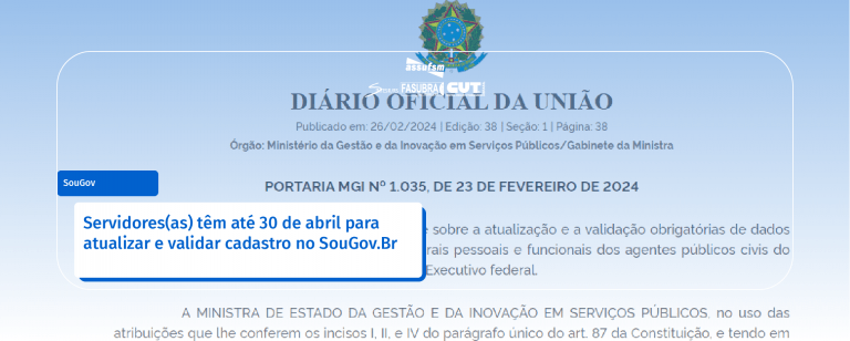 O Ministério da Gestão e da Inovação em Serviços Públicos publicou a Portaria MGI Nº 1.035, datada de 23 de fevereiro de 2024. O texto estabelece medidas relacionadas à atualização e validação obrigatórias dos dados cadastrais pessoais e funcionais dos agentes públicos civis do Poder Executivo Federal.