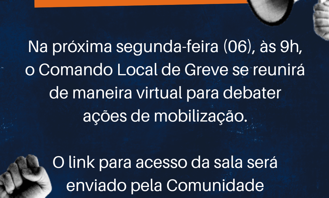 Na próxima segunda-feira (06), o Comando Local de Greve vai se reunir de maneira virtual para debater atividades de mobilização, às 9h. O link para participar do Meet será enviado em nossa Comunidade do Whatsapp.