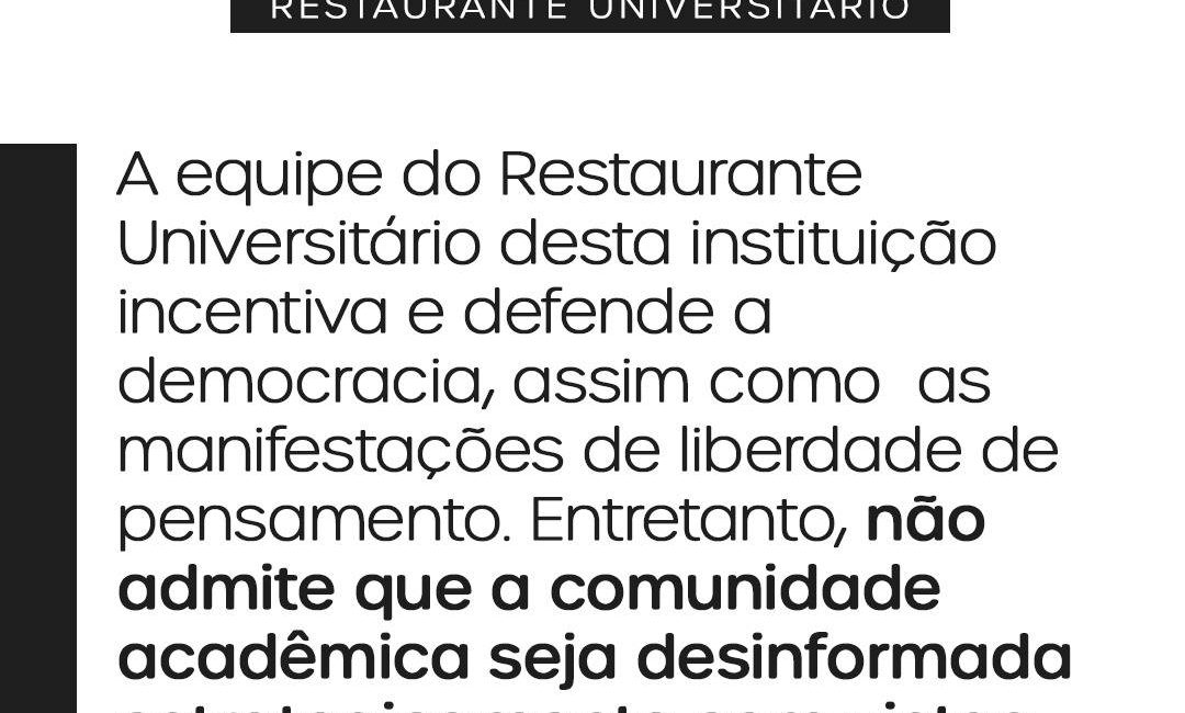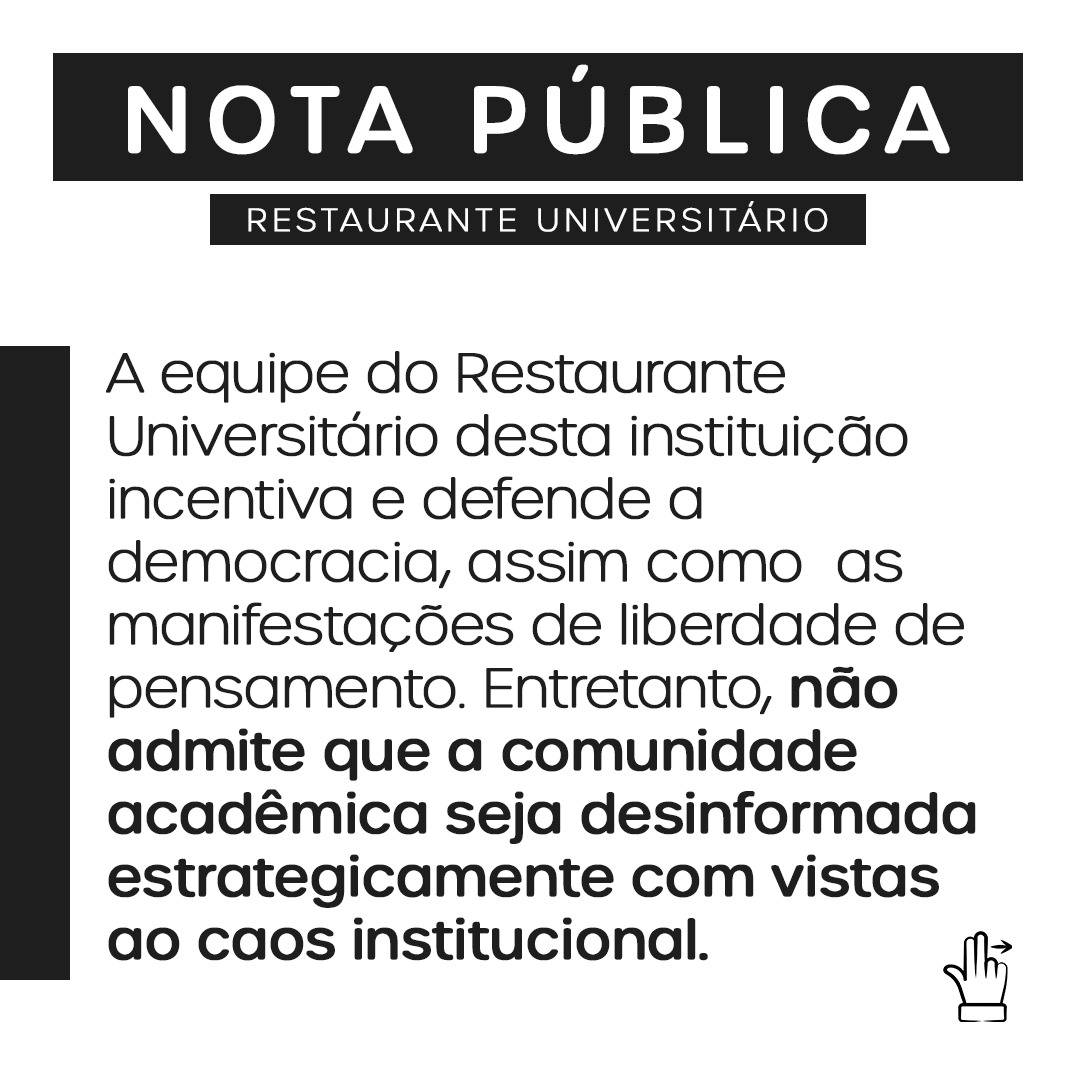 Em nota, TAEs do RU ressaltam que a equipe do Restaurante Universitário da UFSM incentiva e defende a democracia, assim como as manifestações de liberdade de pensamento. Entretanto, não admite que a comunidade acadêmica seja desinformada estrategicamente com vistas ao caos institucional.