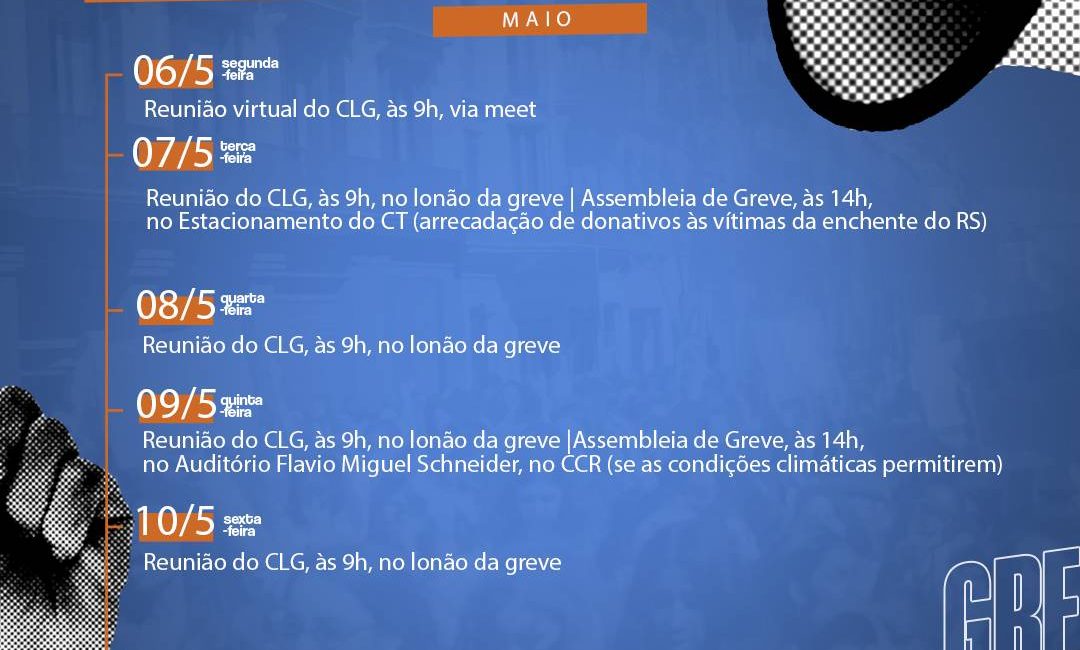 ➡ Terça-feira (07) – Reunião do CLG, às 9h, no lonão da greve | Assembleia de Greve, às 14h, no Estacionamento do CT (arrecadação de donativos às vítimas da enchente do RS)