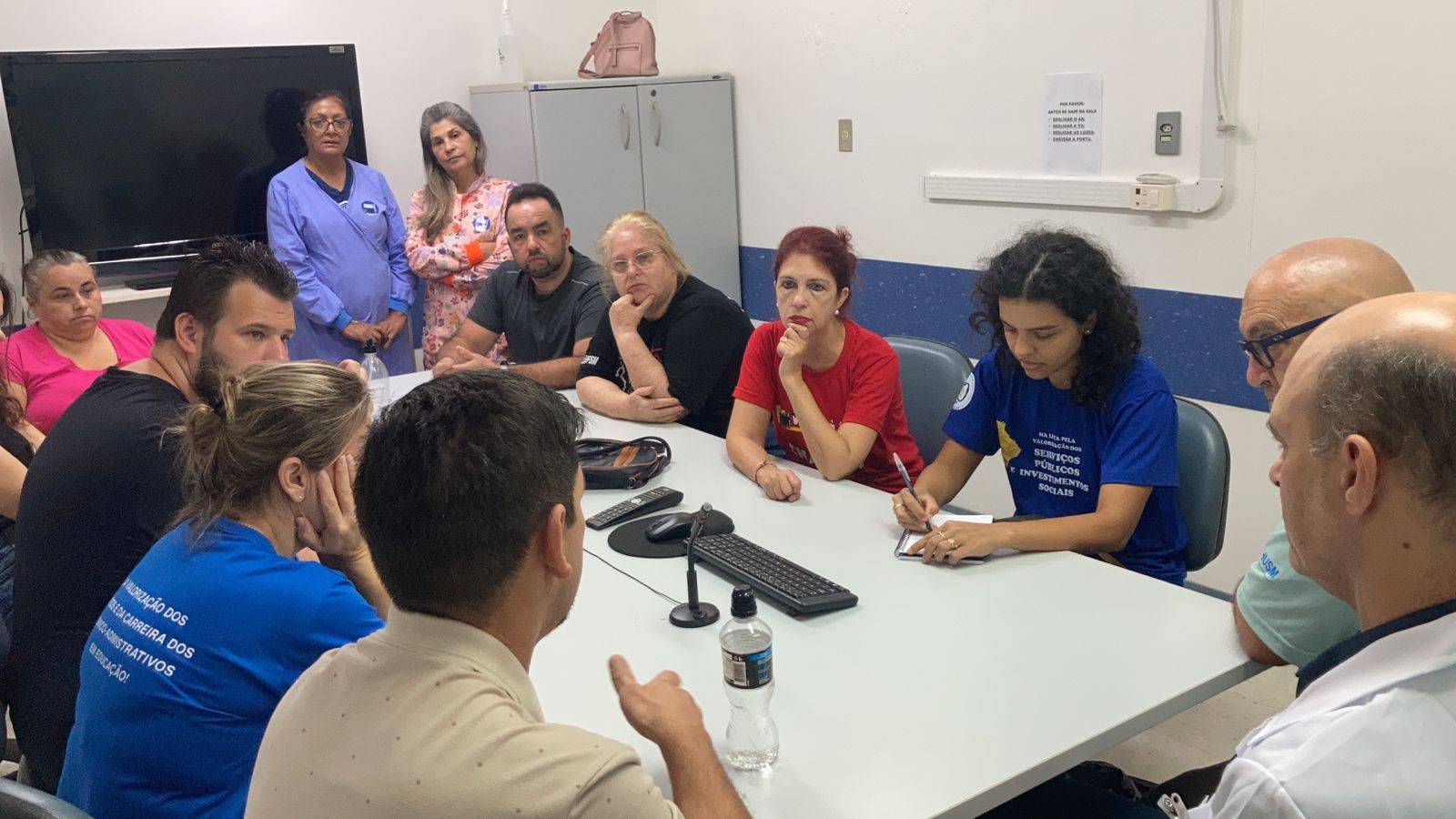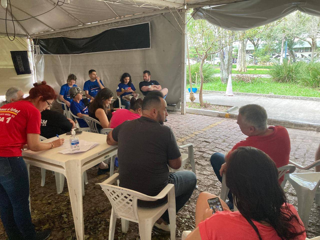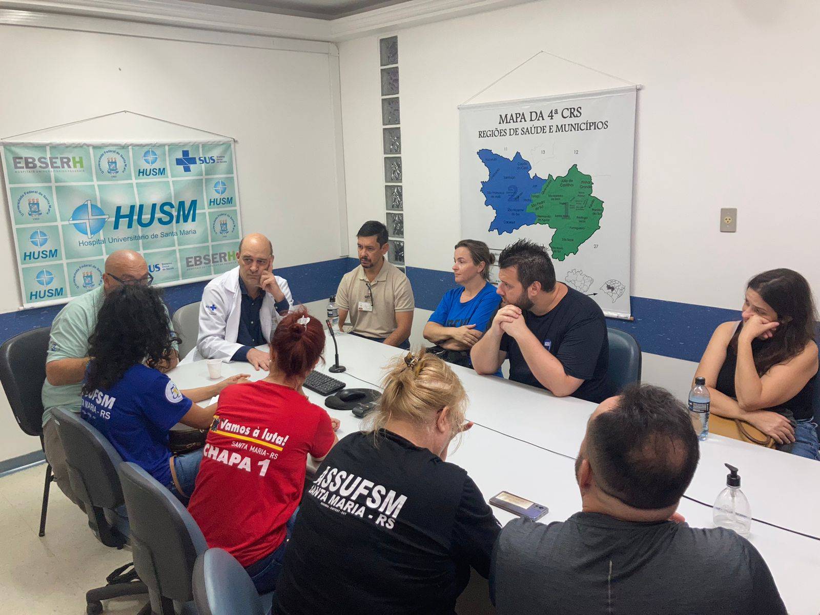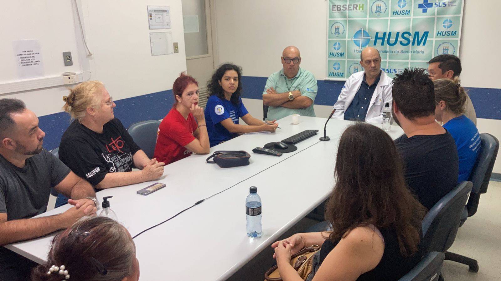 Nesta quarta-feira (08), representantes do Comando Local de Greve (CLG) e do GT Saúde se reuniram com a Superintendência do Hospital Universitário de Santa Maria (HUSM) para debater questões de assédio voltadas aos TAEs grevistas. A gestão do Hospital – representada pelo Superintendente Humberto Palma, o Gerente Administrativo João Batista de Vasconcellos e o Chefe da Divisão de Gestão de Pessoas Glimar de Aquino da Silva – se comprometeu a fazer um chamado às chefias dos setores através de um memorando circular, para prevenção e combate ao assédio. Além disso, ficou firmado que, todas as quartas-feiras, a partir das 8h, o espaço da Sala de Conferências será destinado para tratar dessas questões junto do CLG.