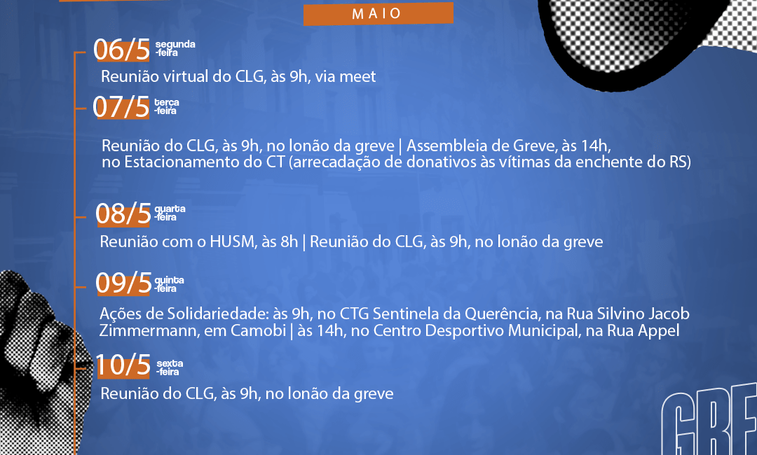 ➡ Terça-feira (07) – Reunião do CLG, às 9h, no lonão da greve | Assembleia de Greve, às 14h, no Estacionamento do CT (arrecadação de donativos às vítimas da enchente do RS)