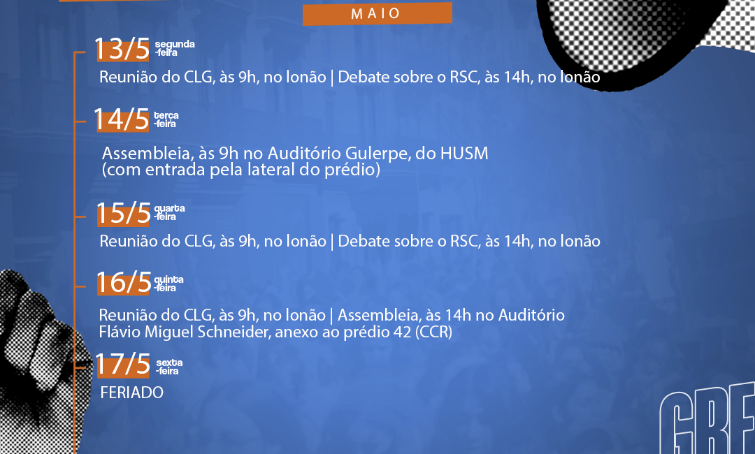 ➡ Segunda-feira (13) – Reunião do CLG, às 9h no lonão; Debate sobre o RSC, às 14h, no lonão