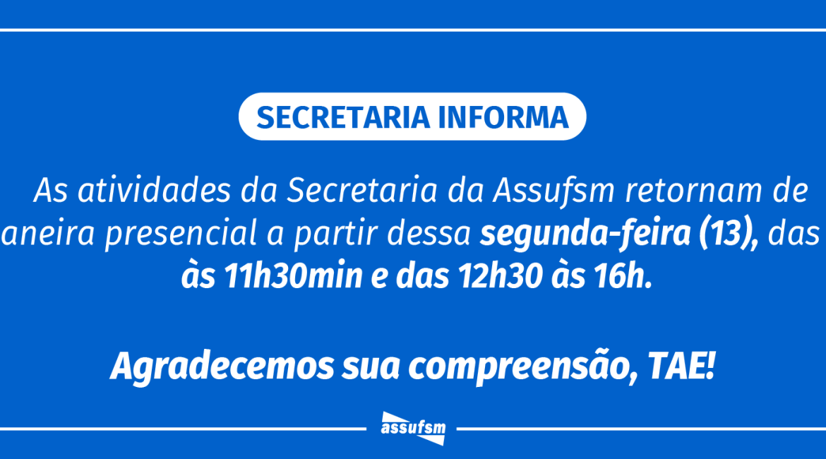 A Secretaria da Assufsm informa que os atendimentos presenciais no Campus Sede da UFSM, no prédio da Reitoria, estão retomados. As secretárias atendem de segunda à sexta-feira, das 7h às 11h30min e das 12h30 às 16h.