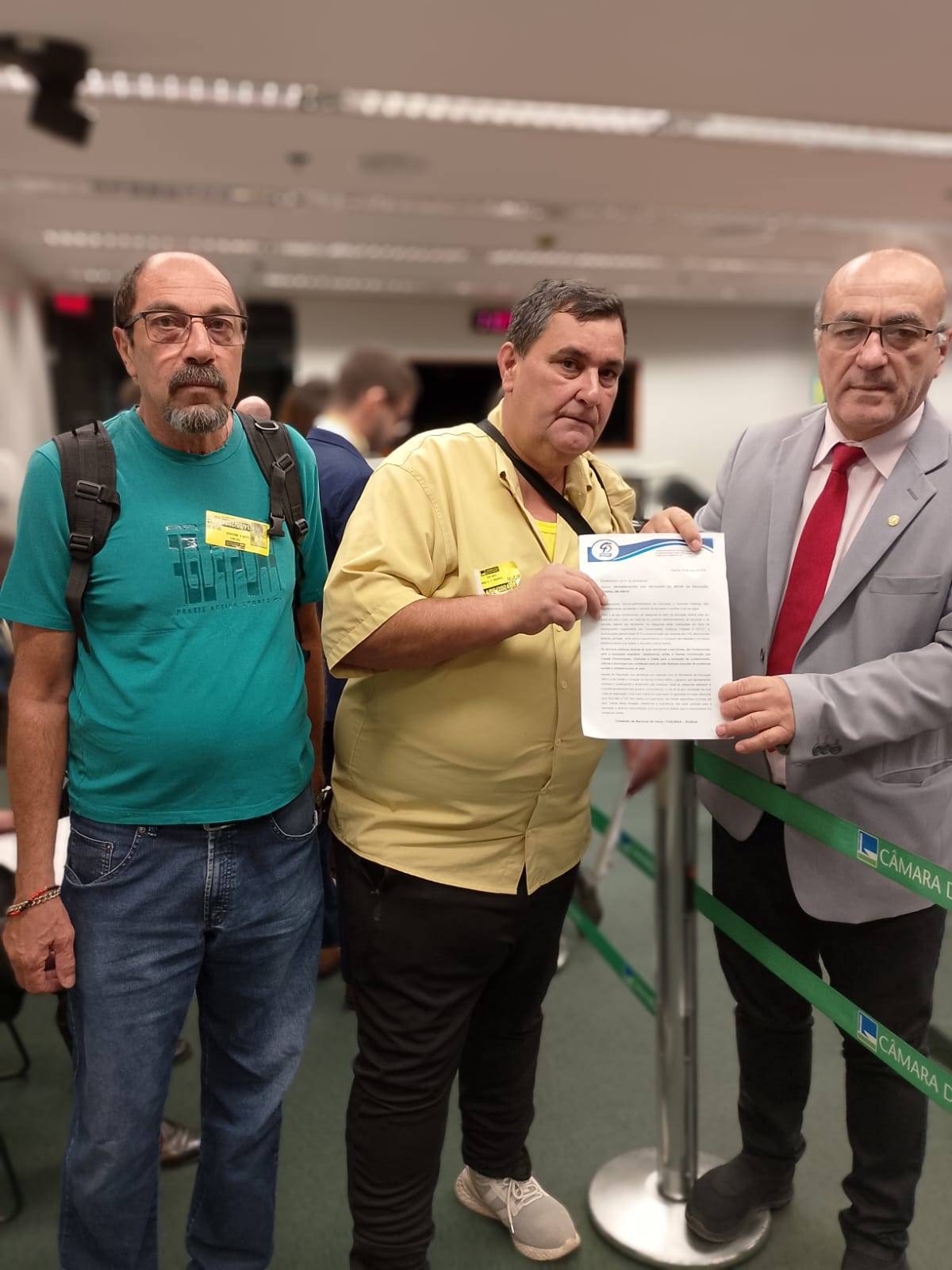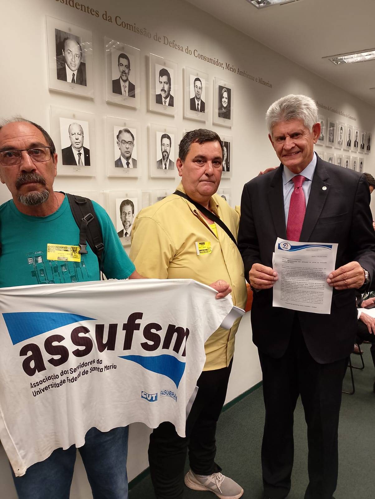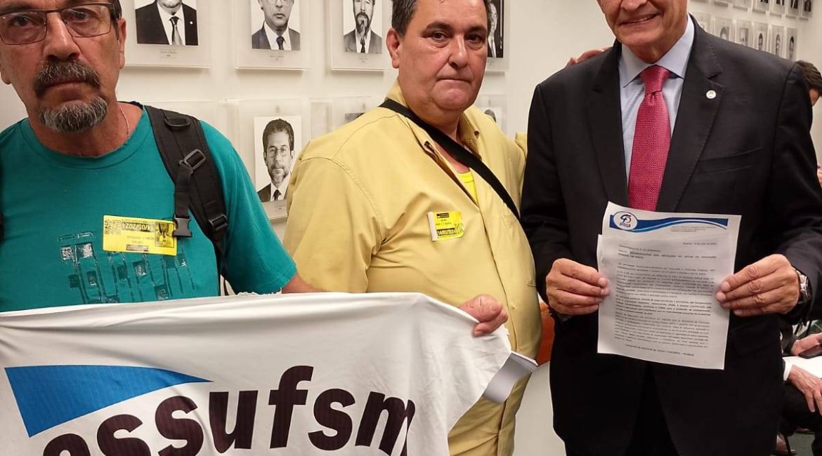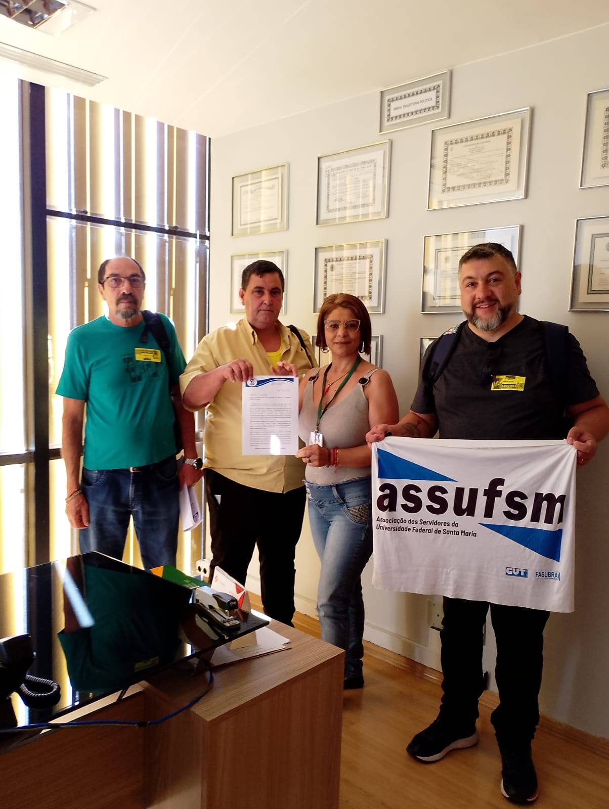 Nesta terça-feira (14) Comando Nacional de Greve (CNG) fez visita à Câmara dos Deputados, buscando aliados(as) para a negociação com o Governo. Representando a Assufsm estão: pela chapa Vamos à Luta Maurício Severo e Cezar Augusto Machado, e pela chapa REUNIR Jorge Trindade (Jorjão) e Roberto Bordin.