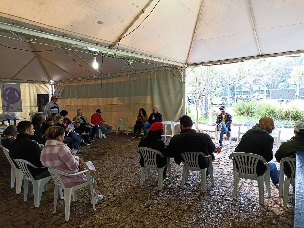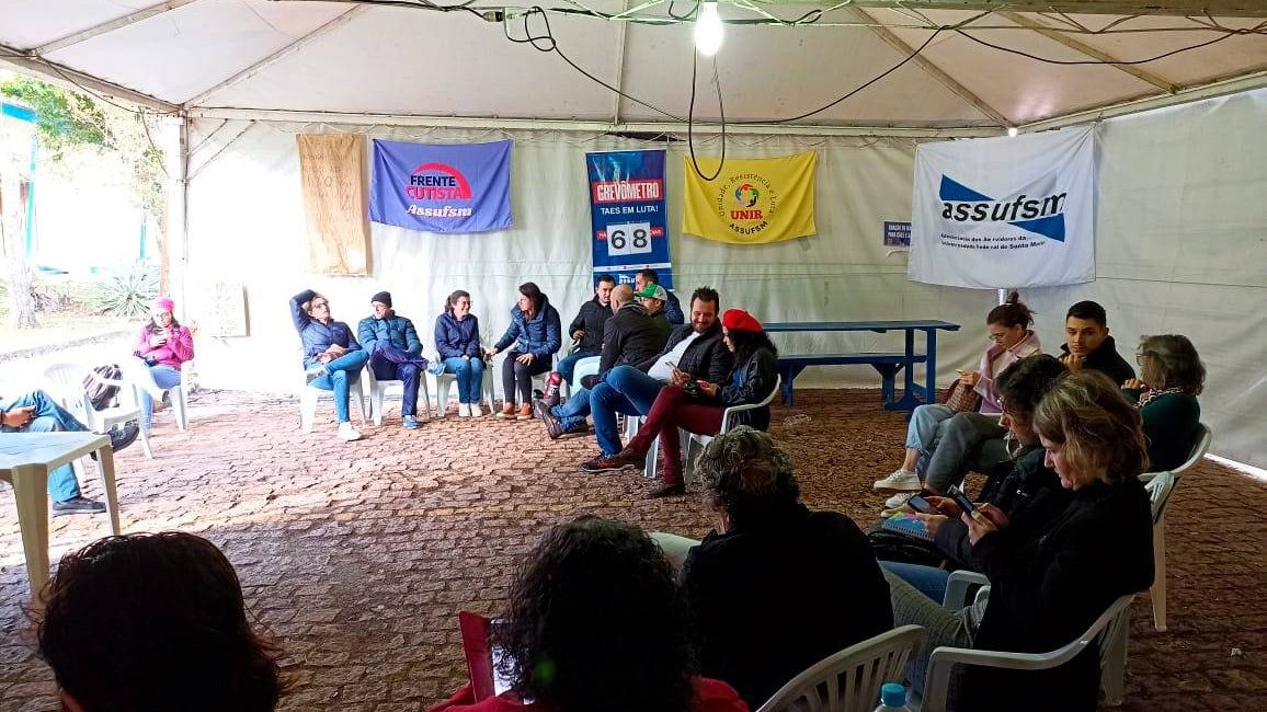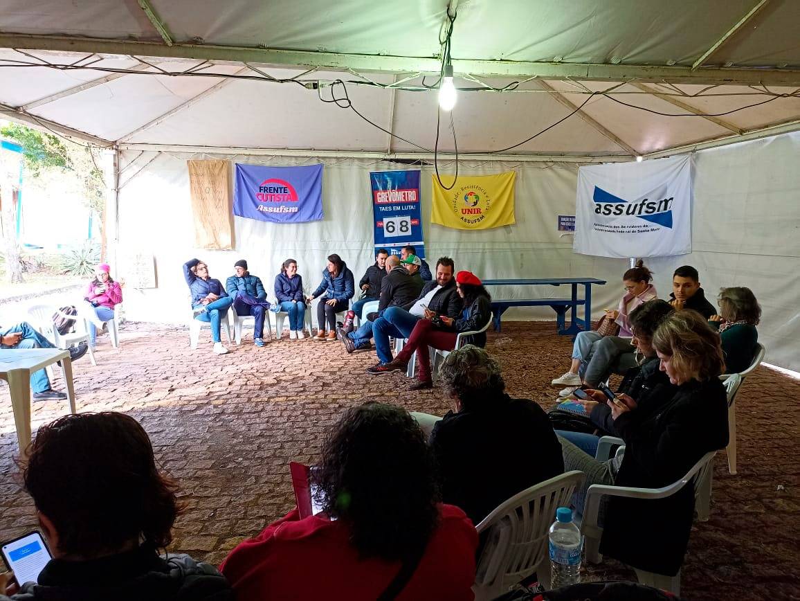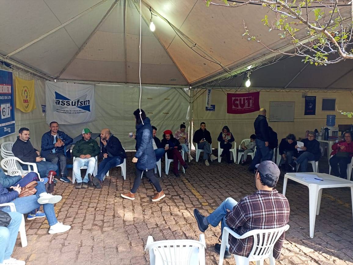 Nesta segunda-feira (20), o Comando Local de Greve (CLG) se reuniu no lonão em frente ao Centro de Ciências Naturais e Exatas (CCNE) para debater sobre as próximas ações e fazer avaliações sobre o movimento paredista que completa 68 dias na UFSM.