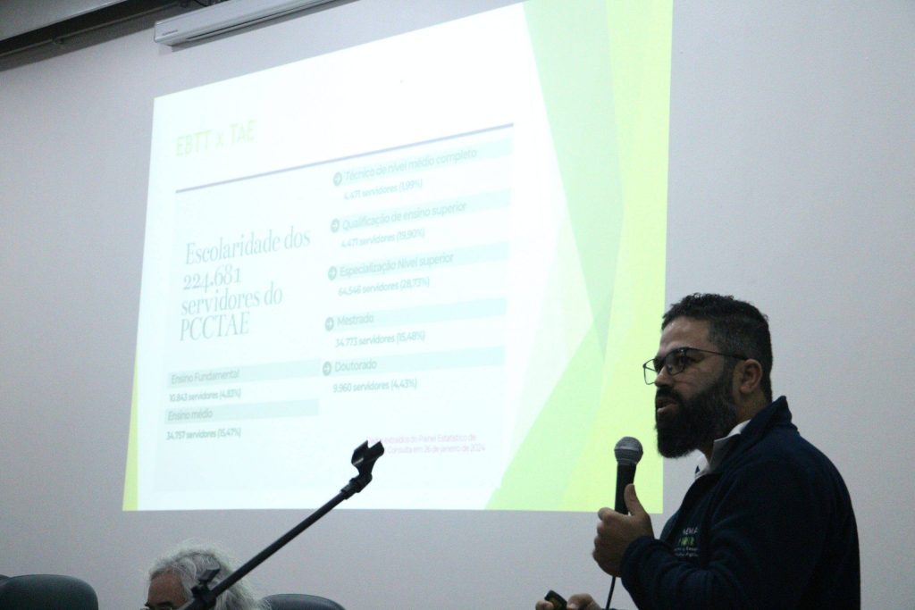 A Assembleia seguiu com a exposição do TAE Edvaldo Faour C. da Silva, lotado no CCR. Edvaldo fez uma síntese das propostas apresentadas para o RSC pelos coletivos que integram a Fasubra: Chapa 30 – Unidade para Lutar, CTB,TRAVESSIA/TNL, UNIR e RESSIGNIFICAR. Confira a apresentação completa aqui.