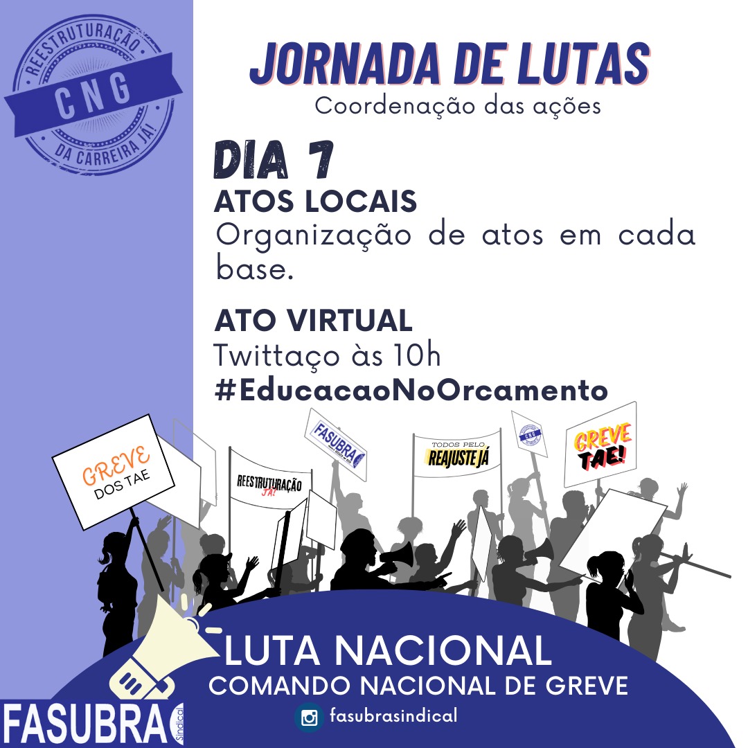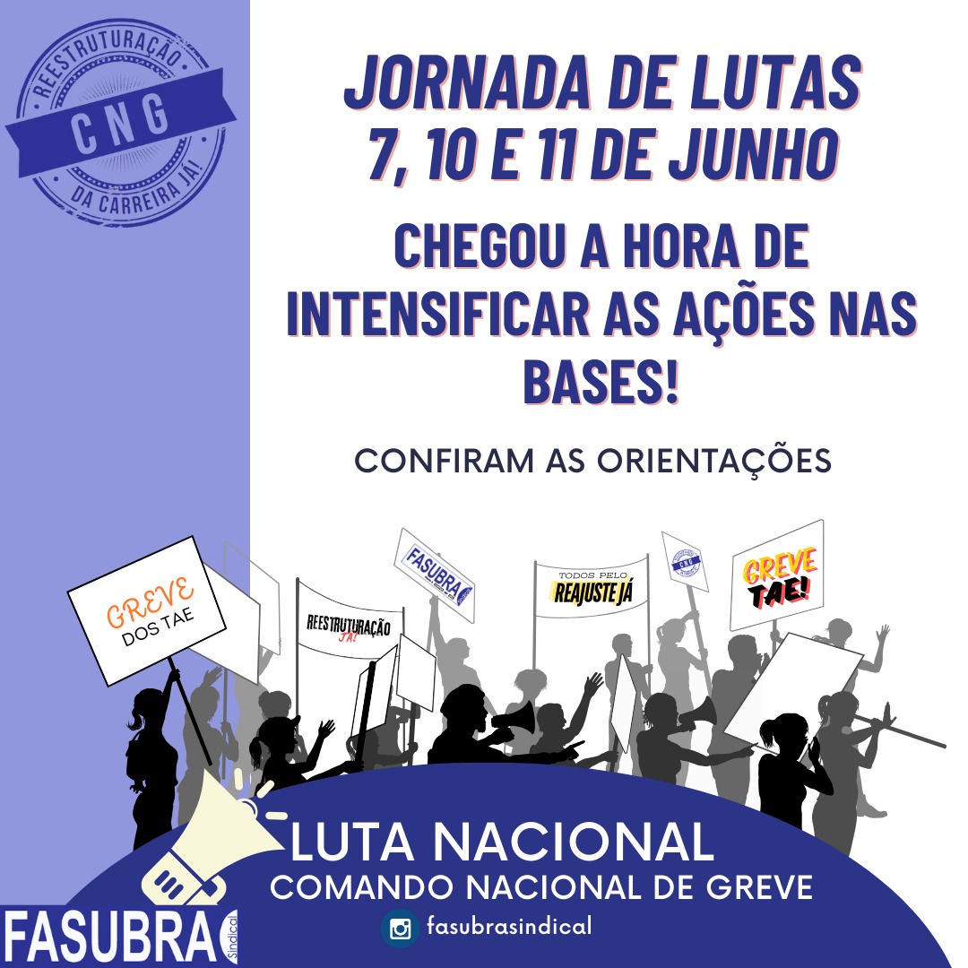 Diante desses fatos novos, o CNG/FASUBRA se reuniu nessa terça feira, 04 de junho, para avaliar esses novos fatos, chegando a conclusão que é absolutamente necessário que possamos aumentar a visibilidade da greve ocupando todos os espaços para disputar efetivamente o orçamento, com ações nas ruas, nas redes e a pressão sobre o parlamento.