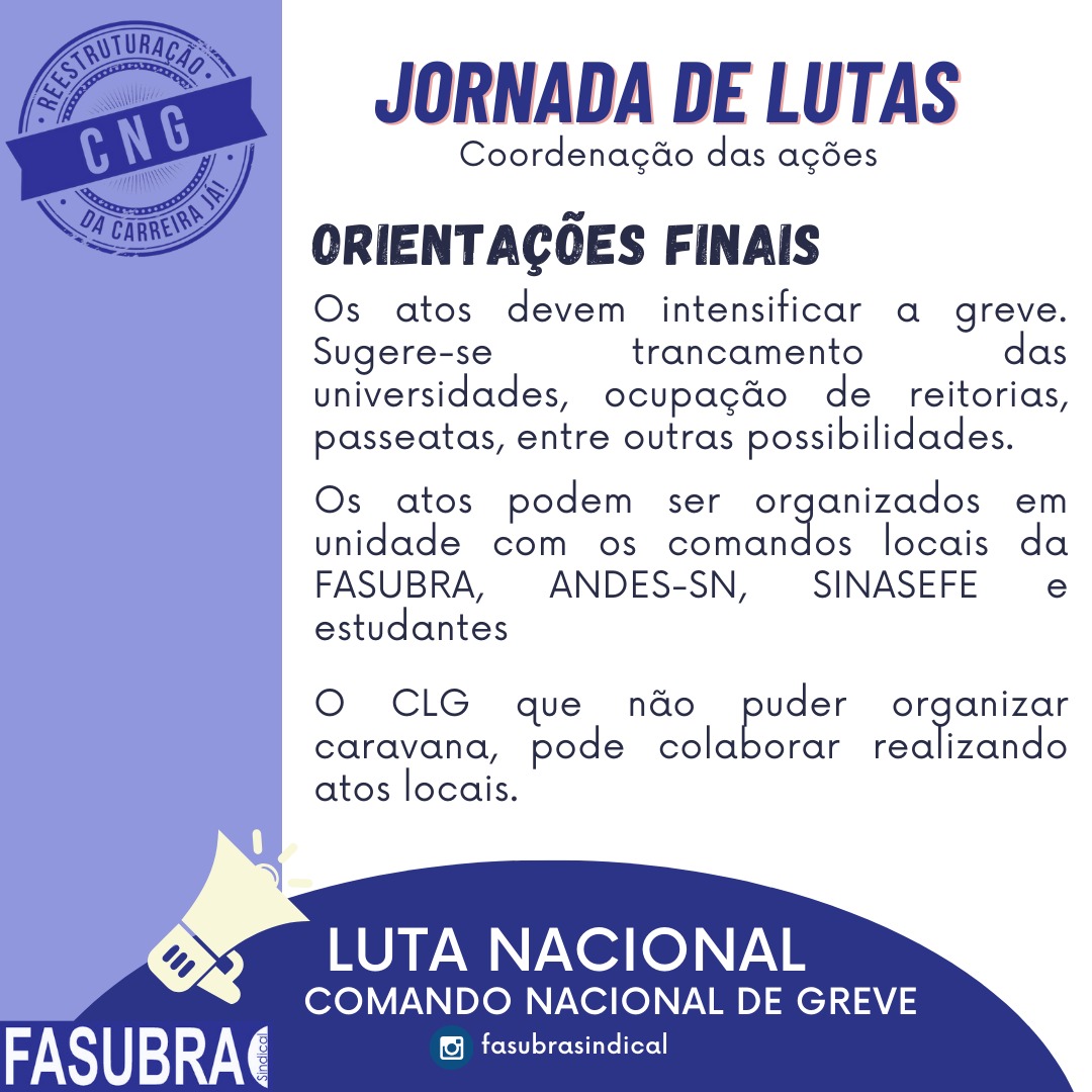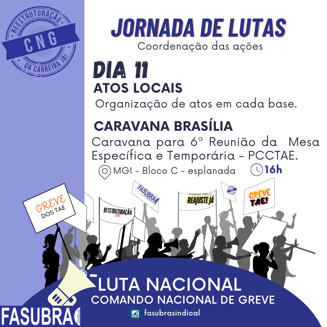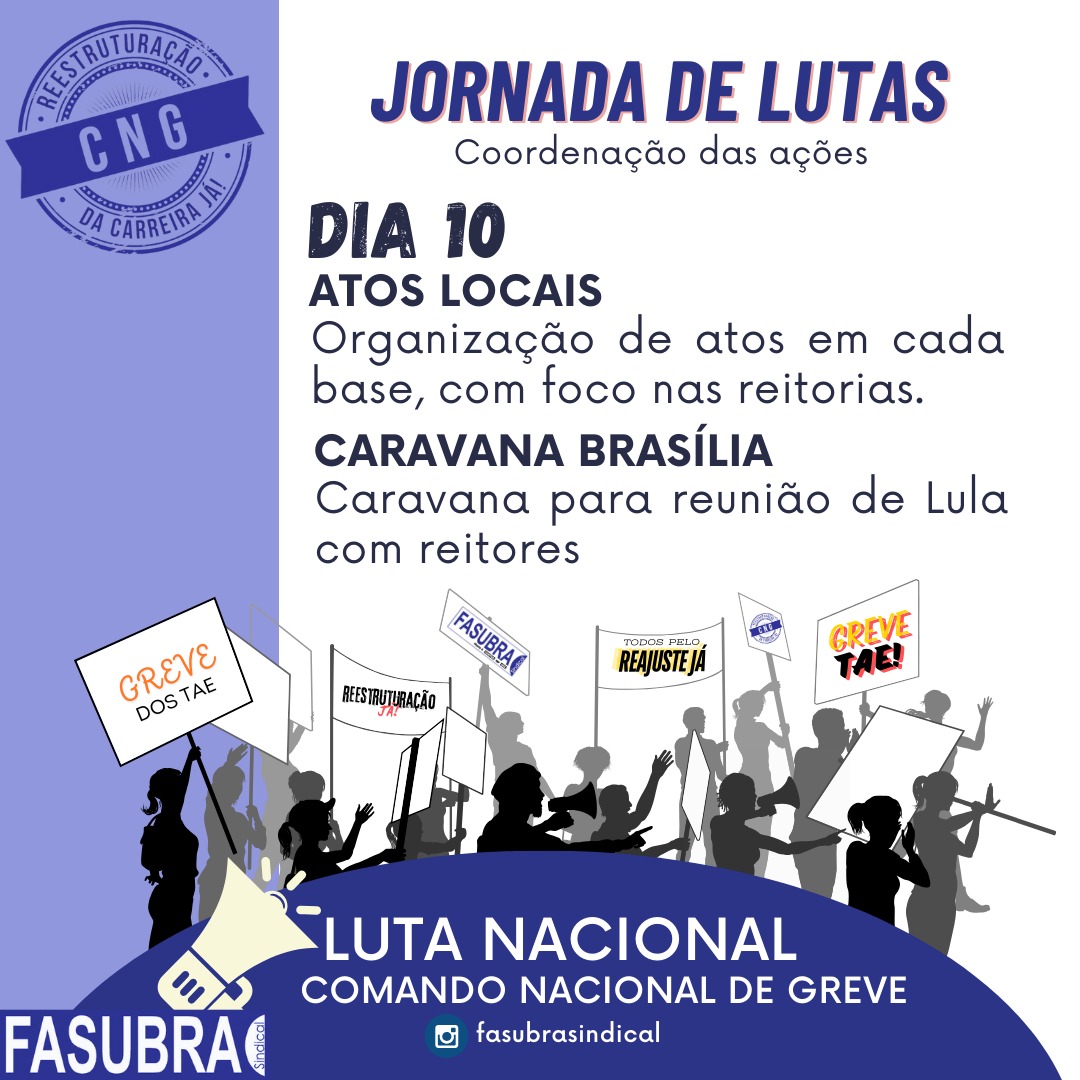 Caravanas de bases próximas a Brasília no dia 10 e 11 de junho. O CNG/FASUBRA está estudando a possibilidade de ajudar com um aporte financeiro as entidades filiadas mais próximas da capital federal para intensificar o número de caravaneiros nos dias da reunião entre Lula e Reitores das IFES (10/06) e no dia da mesa de negociação dos TAE ( 11/06).