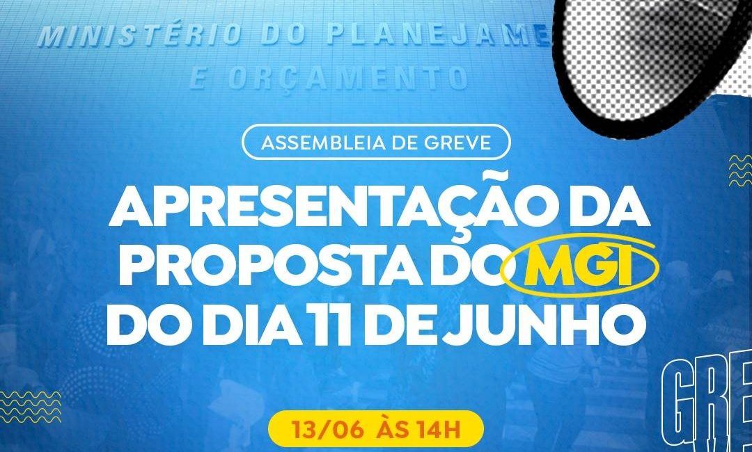 AMANHÃ (13), às 14h, no Auditório Flávio Miguel Schneider (CCR), a Assembleia de Greve vai apresentar a proposta do Ministério da Gestão e Inovação divulgada no dia 11 de junho, na 6° reunião da Mesa Específica e Temporária.