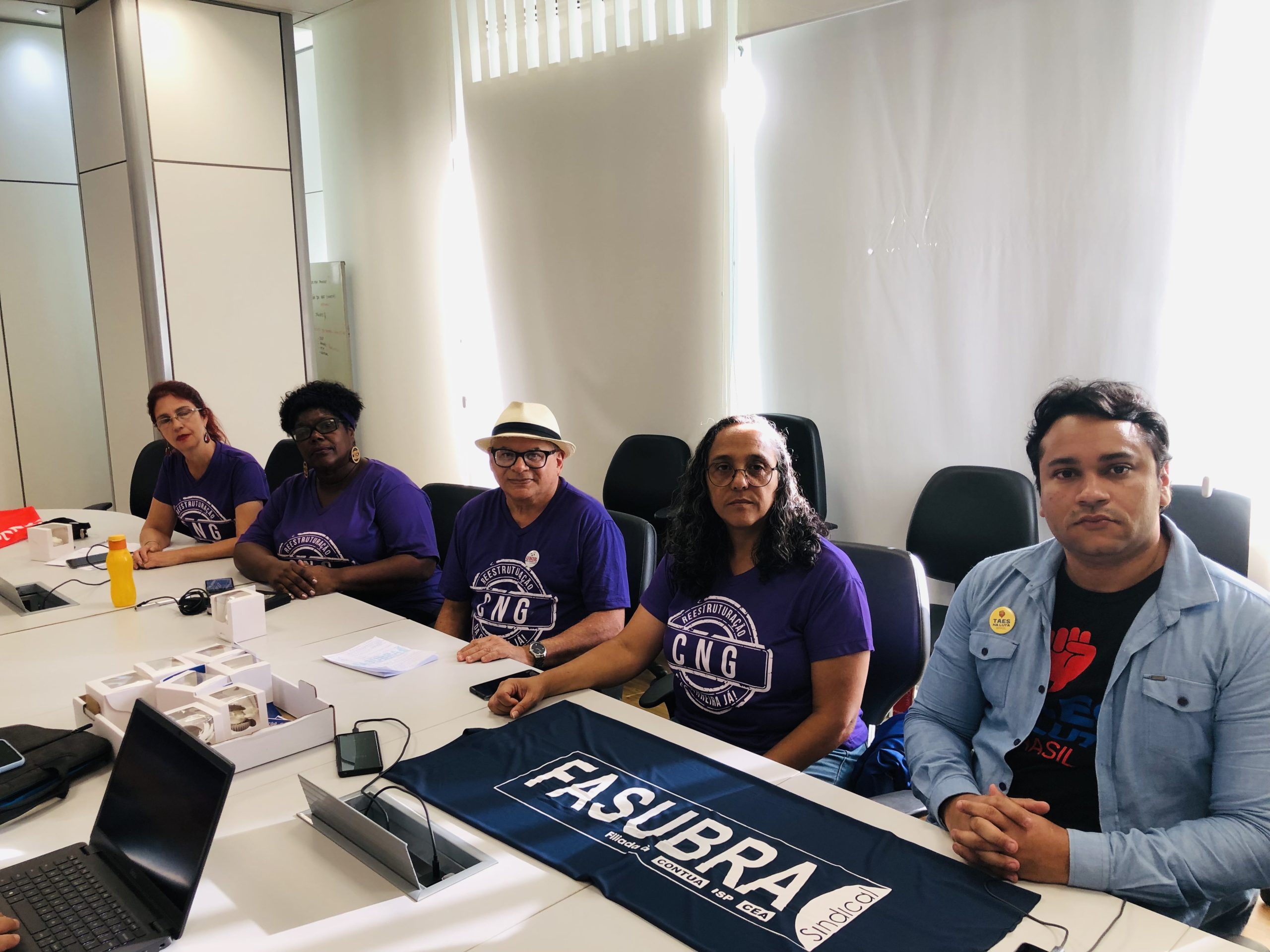 Com 90 dias em greve, a FASUBRA participou, juntamente com o SINASEFE, da 6a. Reunião da Mesa Específica e Temporária – PCCTAE, com o governo. Participaram da reunião, pela FASUBRA, as Coordenadoras Gerais, Cristina del Papa, Ivanilda Reis e Loiva Chansis, os Coordenadores Jurídicos e de Relações de Trabalho, Marcelo Rosa e Daniel Farias.