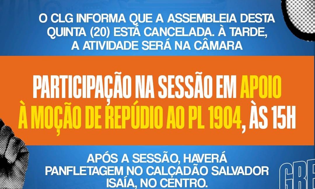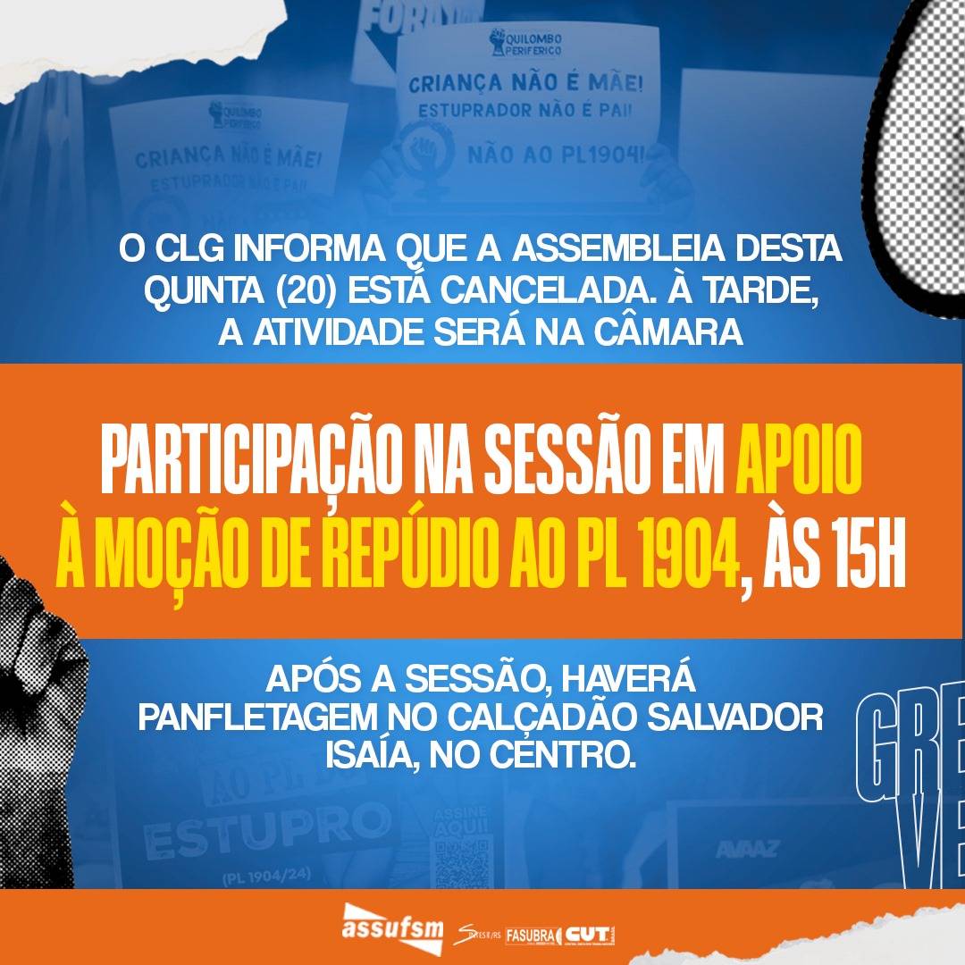 Na tarde desta quarta-feira (29), o GT Mulheres Trabalhadoras se reunirá com a categoria no lonão para debater o PL 1 904/2024. Frente a importância do assunto, o CLG decidiu por cancelar a Assembleia que estava marcada para a tarde de amanhã, quinta-feira (20), chamando todos(as) a participarem da sessão na Câmara de Vereadores de Santa Maria, que colocou na pauta a moção de repúdio ao PL 1 904/2024, por proposição da vereadora Marina Calegaro. Após a sessão, haverá panfletagem no Calçadão Salvador Isaía, no centro de Santa Maria.