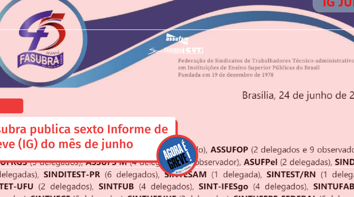 A Fasubra publicou na última segunda-feira (24), o Informe de Greve n° 6 do mês de junho. No documento, consta informes sobre a reunião extraordinária que o Comando Nacional de Greve realizou na tarde de ontem a respeito do Termo de Acordo da greve. Conforme o IG, avaliou-se a posição do governo manifestada em documento que aponta o limite das negociações e convoca para a assinatura do Termo de Acordo. Também está descrito o que é necessário constar no termo de acordo para que a Federação possa, se decidido for pela base, assinar o termo, bem como os próximos passos e orientações do CNG.