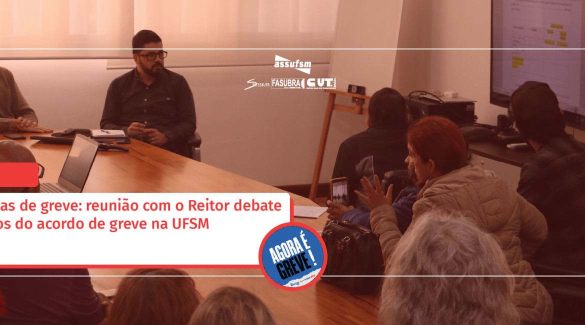 Na tarde dessa terça-feira (02), o Comando Local de Greve esteve reunido com a reitoria da UFSM para debater sobre o Termo de Acordo de Greve para o movimento paredista da Universidade Federal de Santa Maria (UFSM). Na mesa estavam o Reitor Luciano Schuch, a Vice-Reitora Martha Adaime e o Pró-Reitor de Gestão de Pessoas Frank Casado, além da ProJur da UFSM e demais membros do CLG da Assufsm.