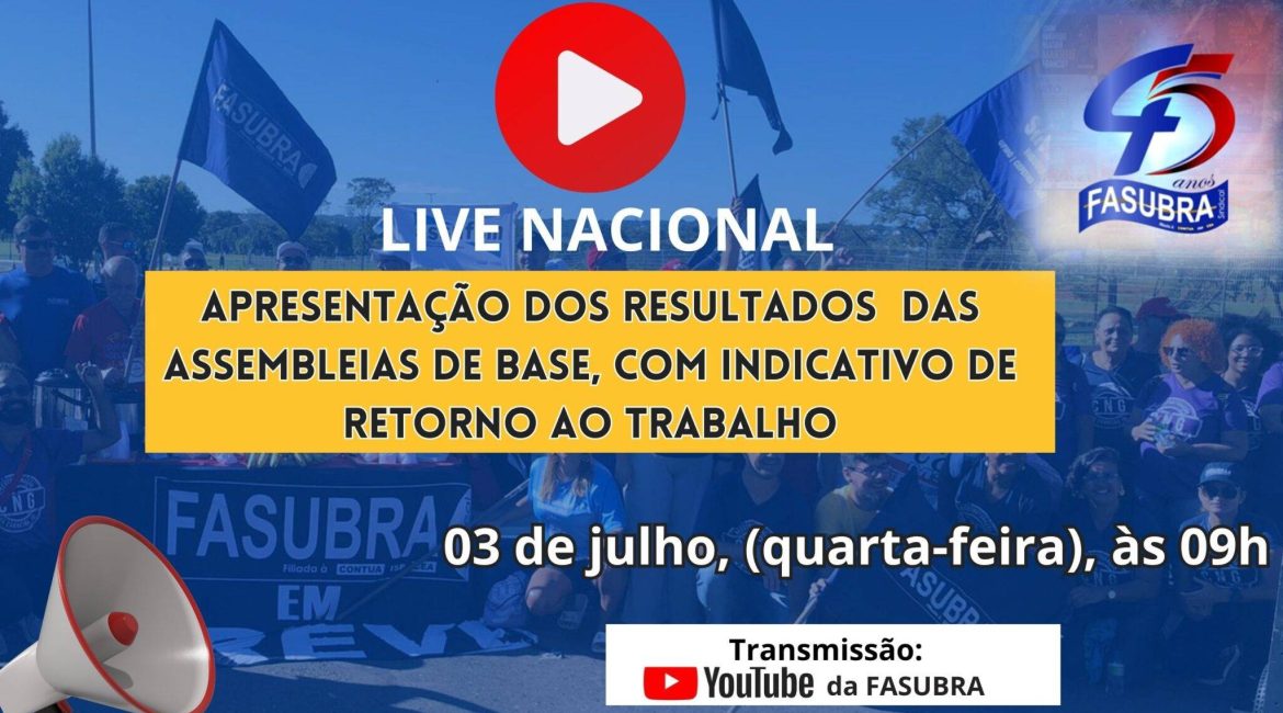 Nesta quarta-feira, 03 de julho, às 9h, teremos mais uma LIVE NACIONAL DA FASUBRA, pelo youtube, com apresentação dos resultados das assembleias de base, com indicativo de retorno ao trabalho.