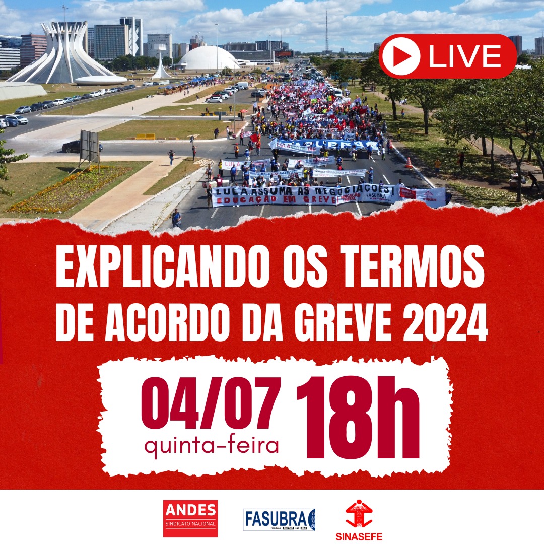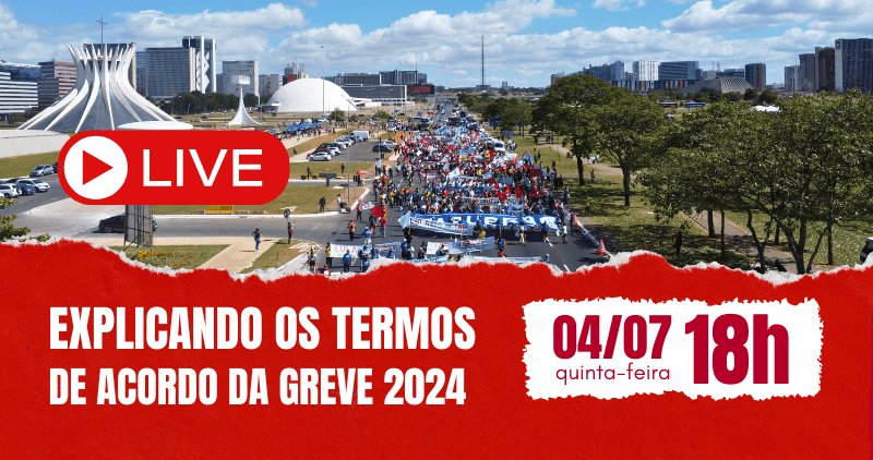 Nesta quinta-feira, (04/07), às 18h, vai acontecer uma LIVE com representantes das três entidades da educação federal, FASUBRA, SINASEFE e ANDES-SN, com explicações sobre os termos de acordo da greve de 2024.