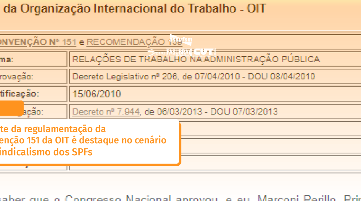 A Convenção 151 da OIT se intitula “Convenção sobre as Relações de Trabalho na Administração Pública” e foi adotada em 1978. Em suma, ela trata dos direitos dos trabalhadores e trabalhadoras do setor público. A reunião com o Grupo de Trabalho Interministerial (GTI), instituído em agosto de 2023, pelo Decreto n. 11.669/2023, caminhou no sentido da elaboração de proposta de regulamentação da negociação das relações de trabalho no âmbito da administração pública federal. O debate sobre a convenção ainda segue no governo federal.