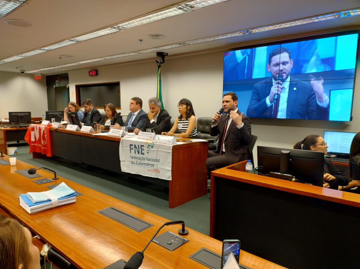 Os palestrantes do evento foram: Daniel Menezes de Souza, Vice-Presidente do Conselho Federal de Enfermagem (COFEN), Livia Angeli, Representante da Associação Brasileira de Saúde Coletiva (ABRASCO), David Athayde, Subsecretário de Planejamento Estratégico da Política Fiscal, Shirley Morales, Vice-presidente da Federação Nacional Dos Enfermeiros, Isabel Cristina Gonçalves, Secretária-Geral da Confederação Nacional dos Trabalhadores em Seguridade Social/CUT.