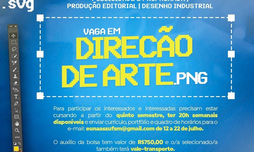 A Assufsm está com uma vaga aberta para estagiários e estagiárias em Publicidade e Propaganda, Produção Editorial e Desenho Industrial (foco em Direção de Arte). Para participar os interessados e interessadas precisam estar cursando a partir do quinto semestre, ter 20h semanais disponíveis e enviar currículo, portfólio e quadro de horários para o e-mail eunaassufsm@gmail.com de 12 a 22 de julho.