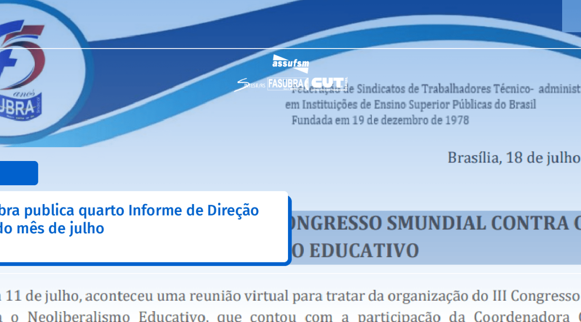 A Fasubra publicou, na última quinta-feira (18), o Informe de Direção n° 4 do mês de julho. No documento, constam o relatório da Reunião Preparatória do III Congresso Mundial Contra o Neoliberalismo Educativo; o relatório da Reunião do GT LGBTI+ da FASUBRA; o aguardado relatório da reunião da CNSC dos dias 16 e 17 de julho e os informes sobre o XXX Seminário Nacional da Segurança das IFES e EBTTs.